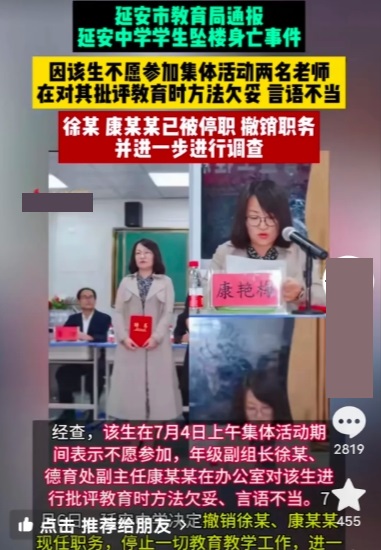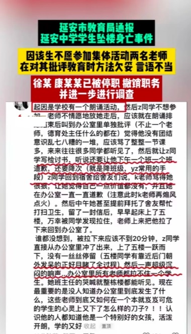 对一个女学生辱骂、逐班道歉、降级,请问这也叫批评教育?学生第一次跳楼被阻止,老师拉到办公室又说了什么?为什么没有被安抚?难道又在孩子本已经受伤心灵上捅刀子不成?