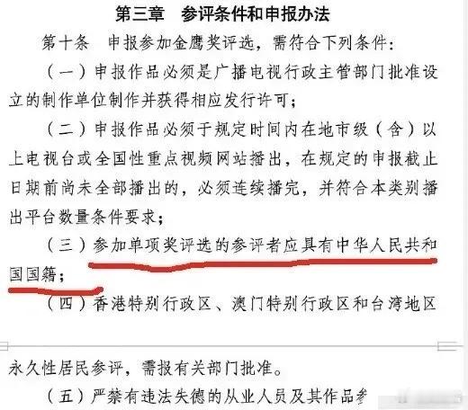 中国电视金鹰奖新增了一项规定:参加评奖的人必须具有中国国籍,那好多明星拿不了奖了