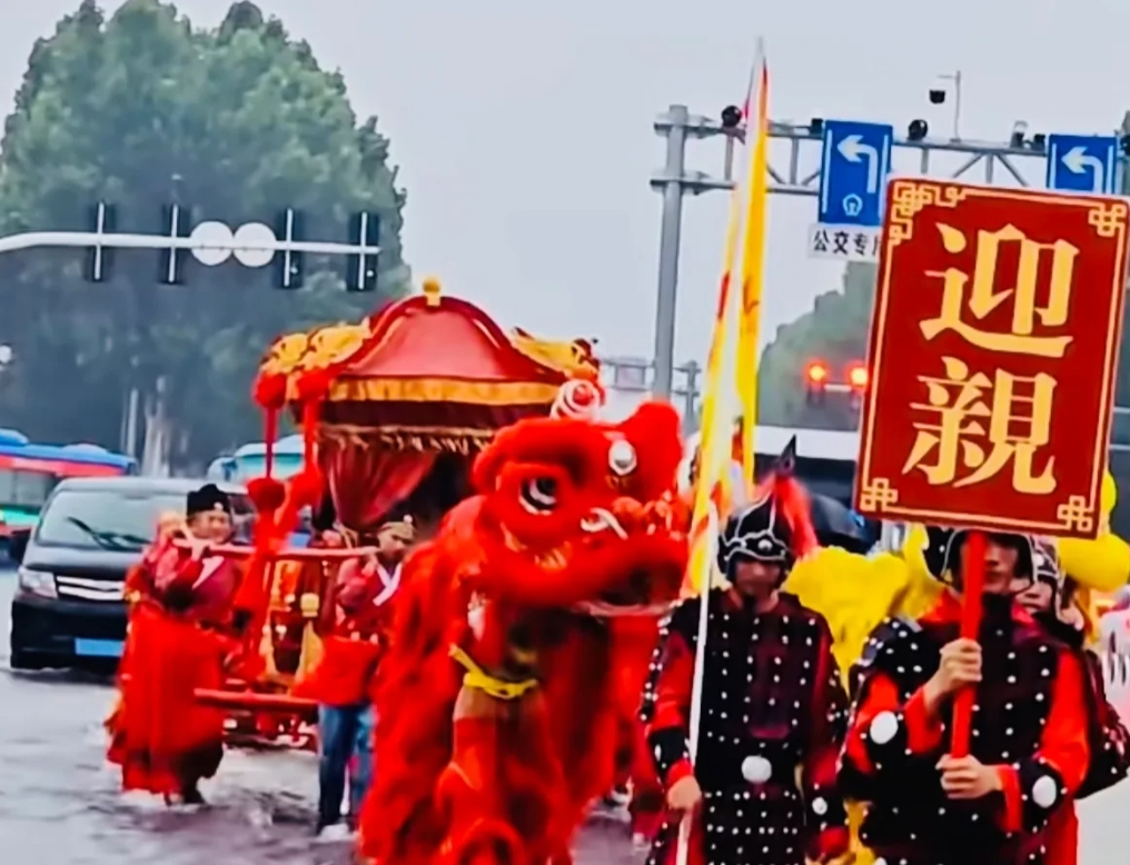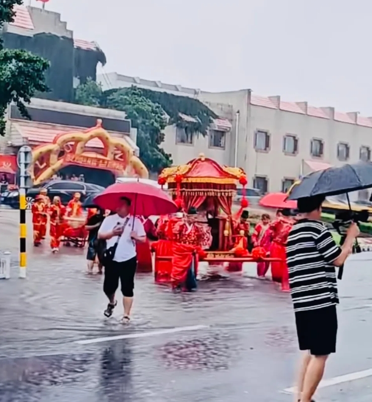 山东临沂,暴雨中惊现八抬大轿迎亲,迎亲团队:寓意顺风又顺水!