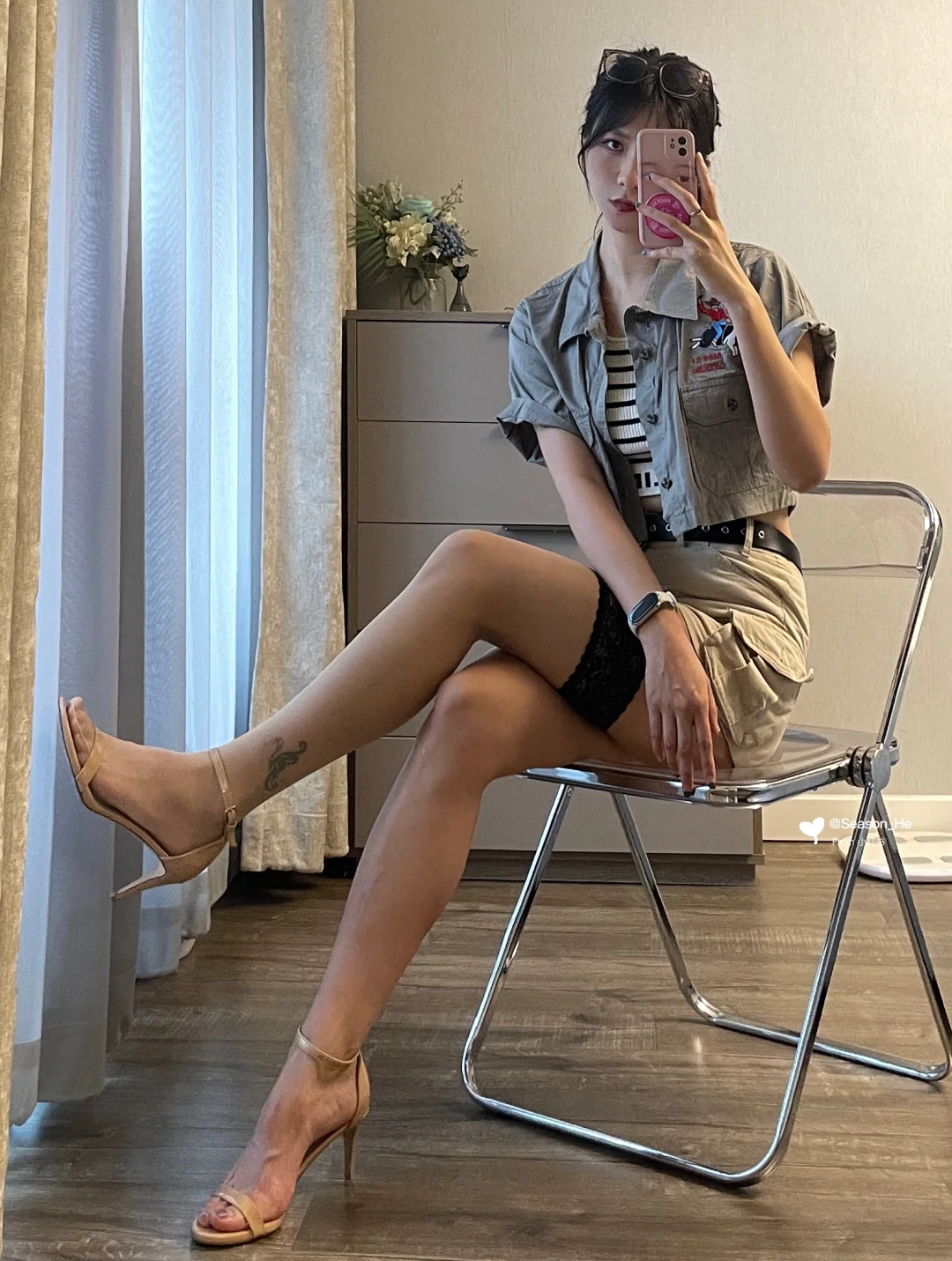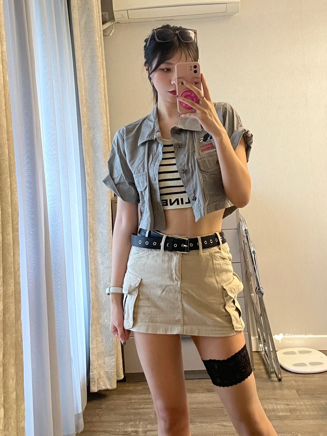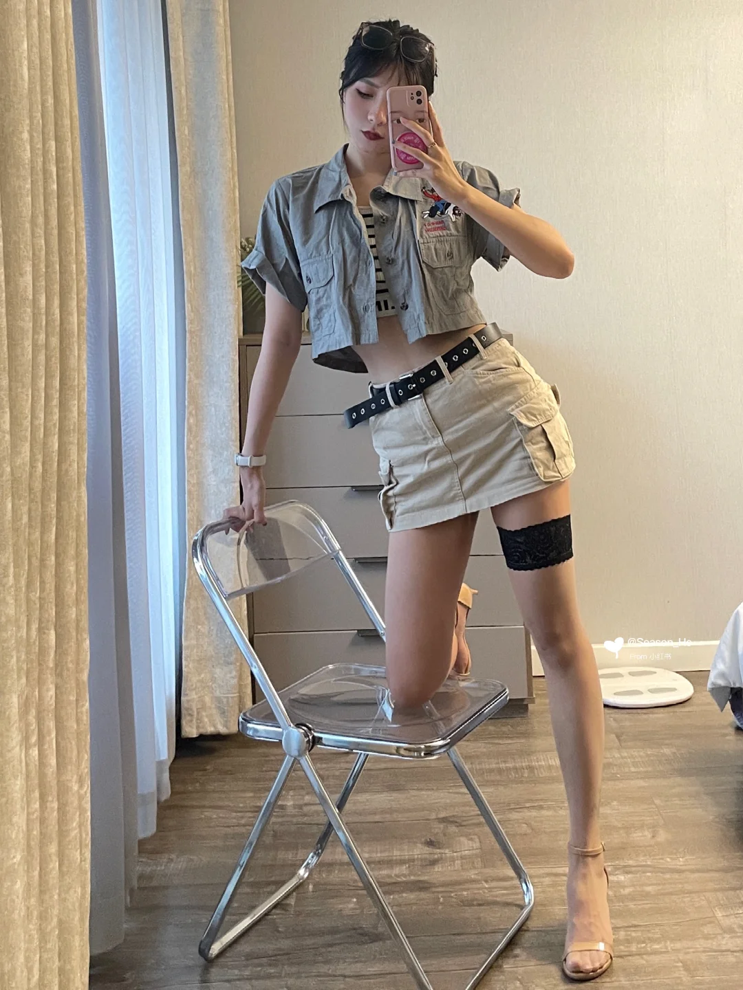丝袜配工装裙,钓系姐姐玩转混搭风,这身材比例真是绝了,时尚圈新宠啊