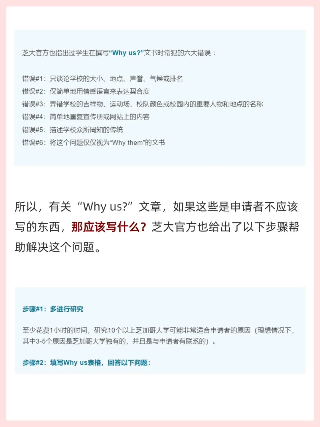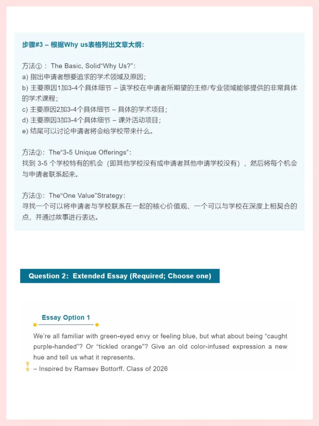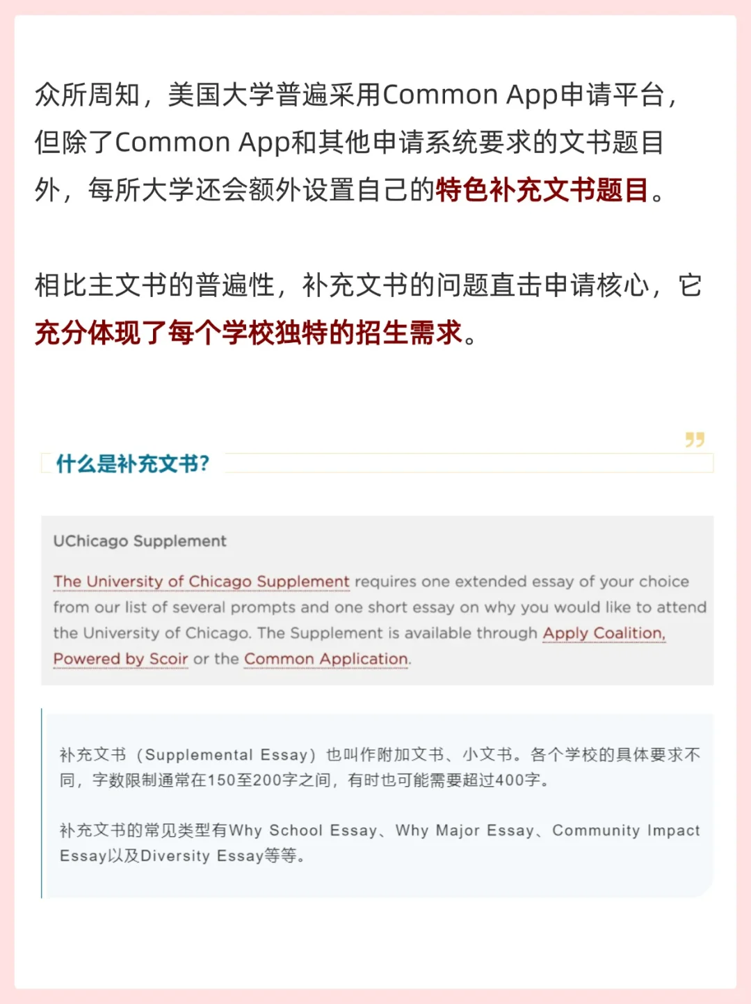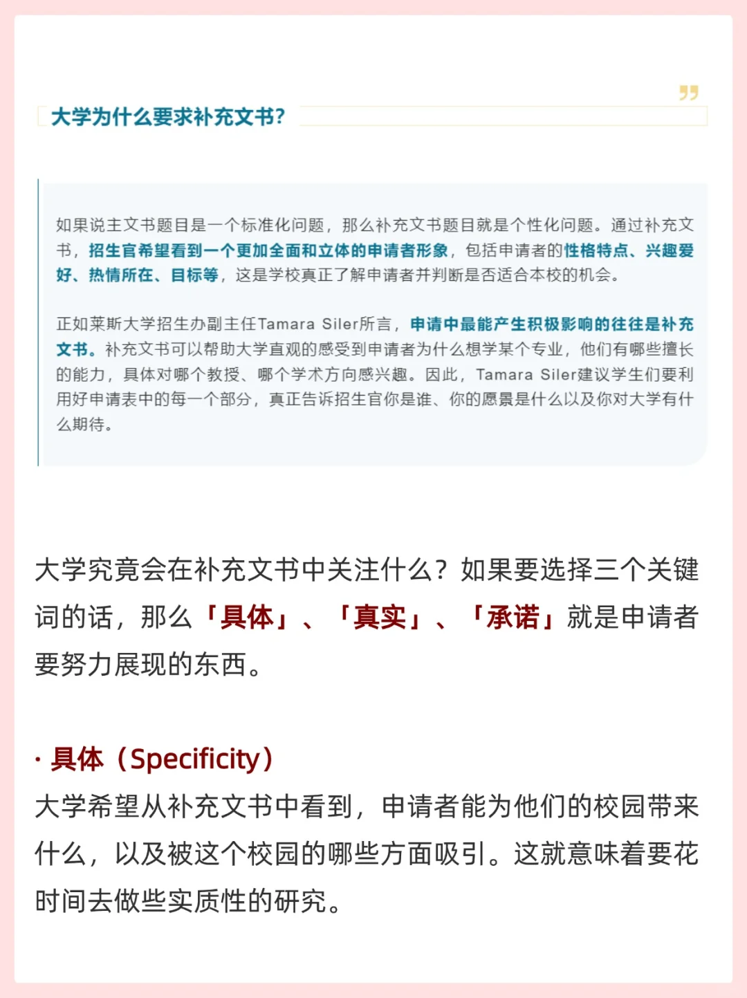 相比主文书的普遍性,补充文书的问题直击申请核心,它充分体现了每个学校独特的招生需求。