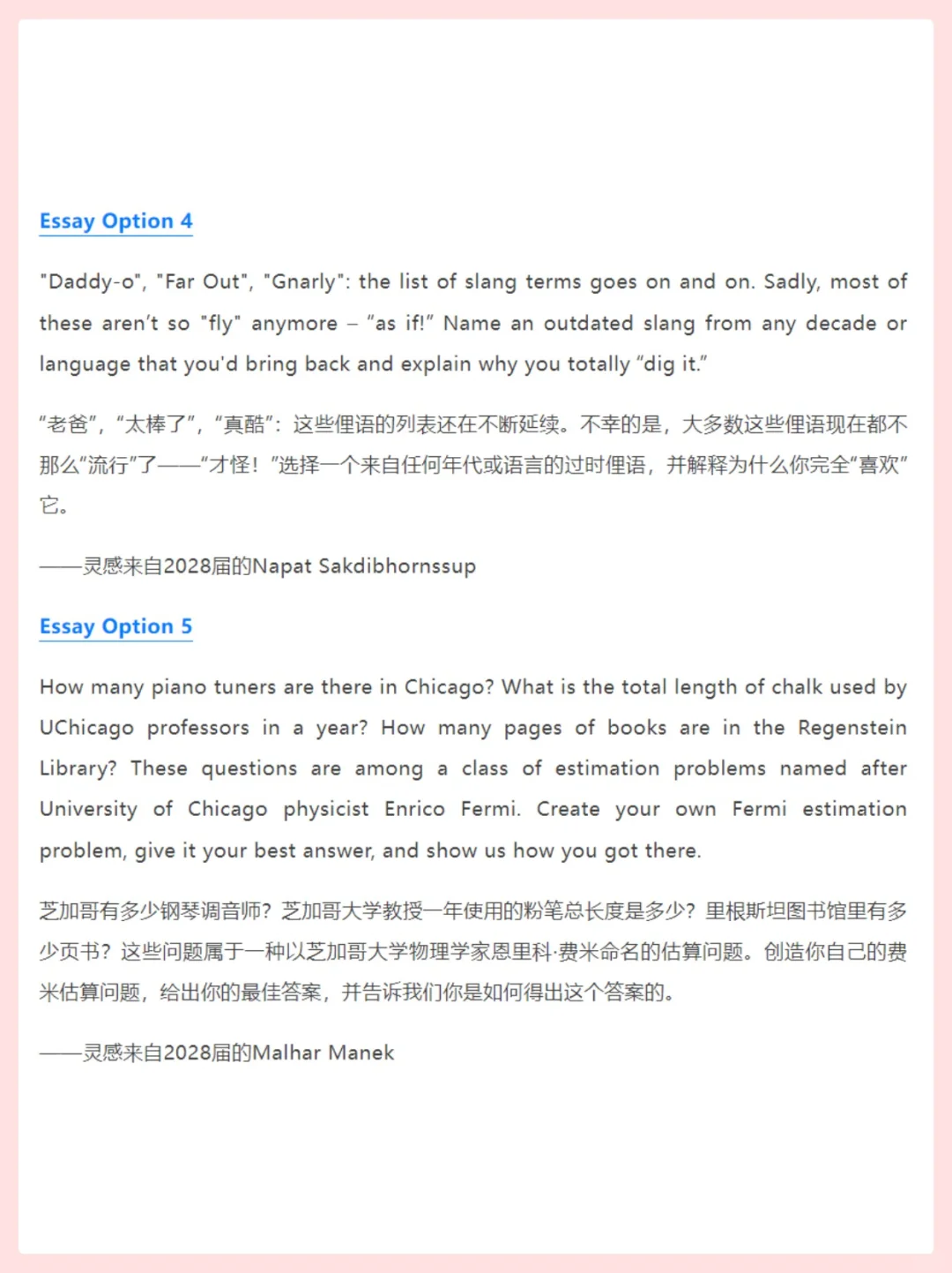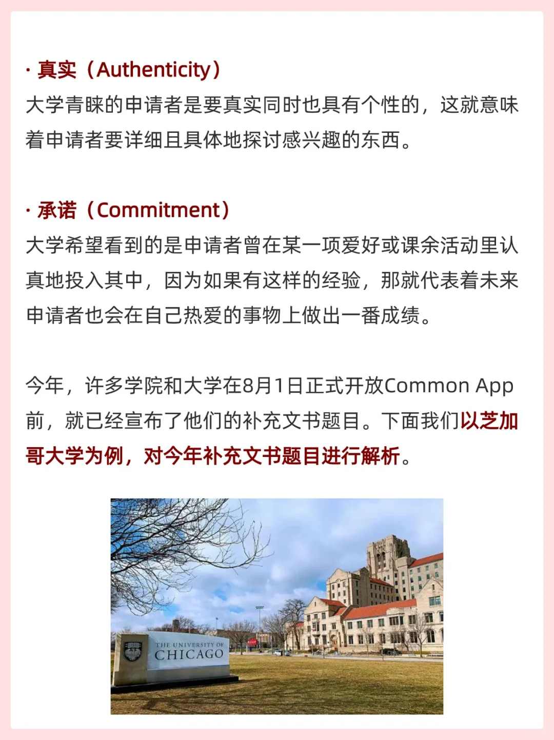 今年,许多学院和大学在8月1日正式开放Common App前,就已经宣布了他们的补充文书题目。下面我们以芝加哥大学为例,对今年补充文书题目进行解析。