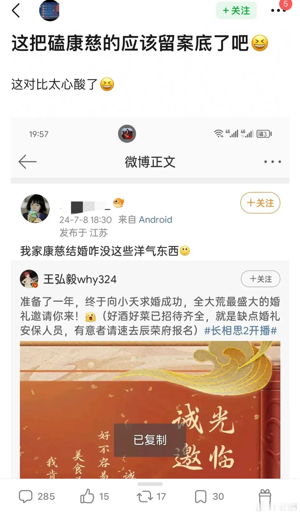 王弘毅因为发了和小夭婚礼的邀请书被审判,说他拜高踩低,不卖康慈,收官还只发个人的九宫格