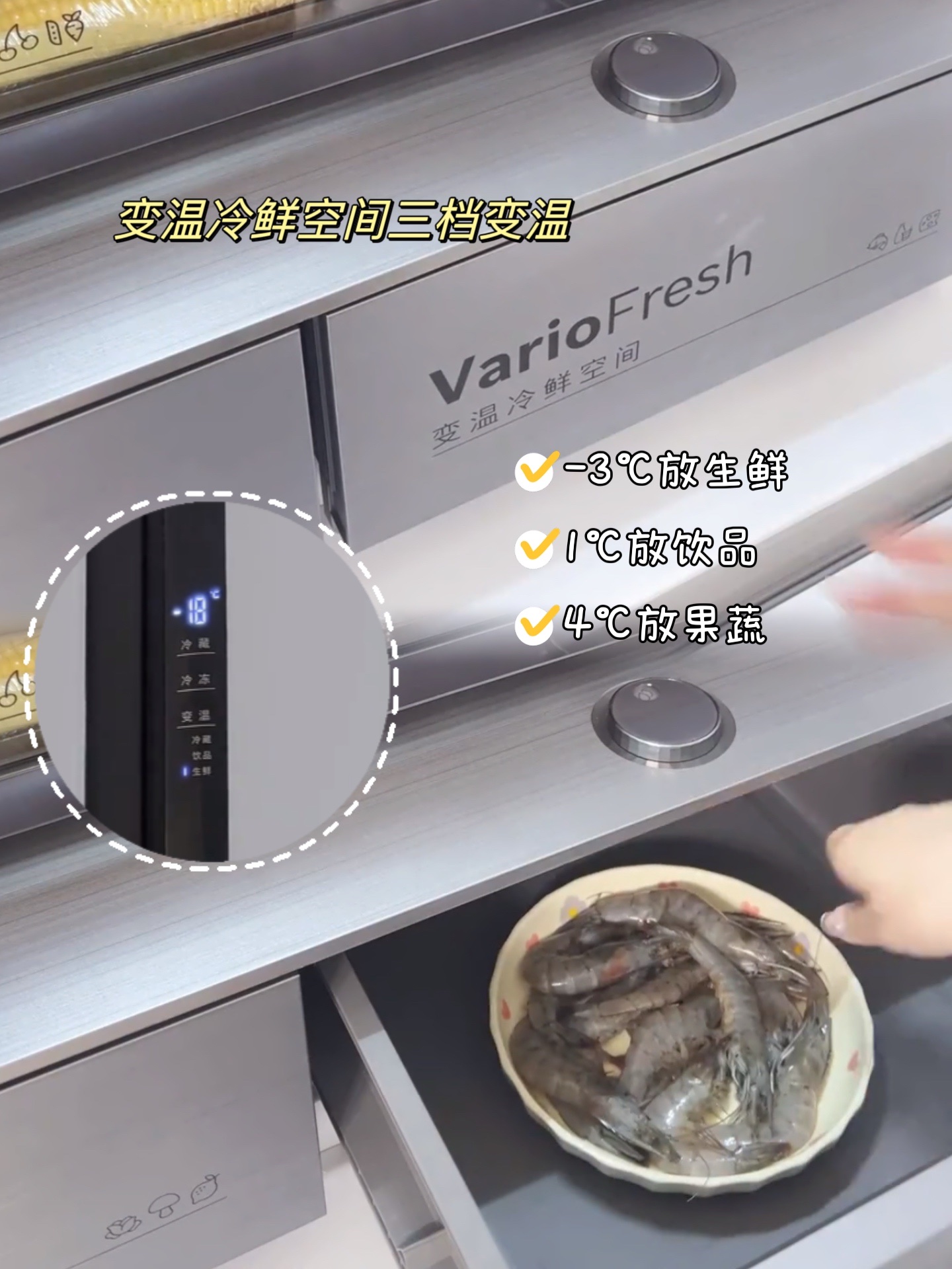 冰箱的三档变温空间设计也很nice,可以根据不同的储存需求调节温度,-3°C的低温适合存放肉类、生鲜,买回来的鱼虾放在这里,既可以保持鲜嫩的口感,也能避免反复解冻的不便。夏天来啦,可以调节至1°C,爽口的冰饮料这不就来啦。