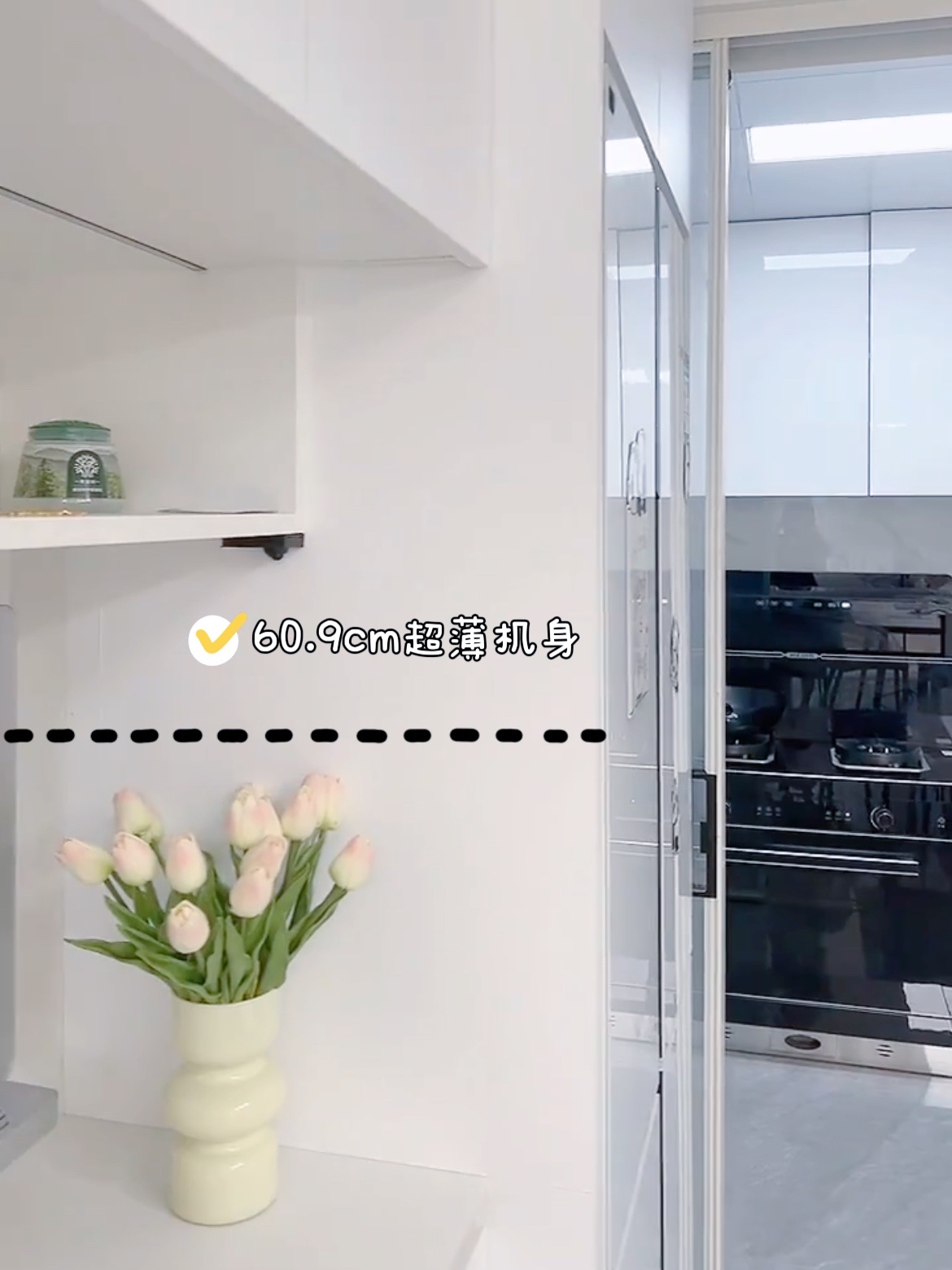 在白色冰箱里对比了很久最终入手了Bosch/博世小白鲸,它的白色外观与我的奶油风格家居完美融合,它的尺寸对我家超友好,60.9cm超薄机身可以轻松嵌入我家餐边柜。