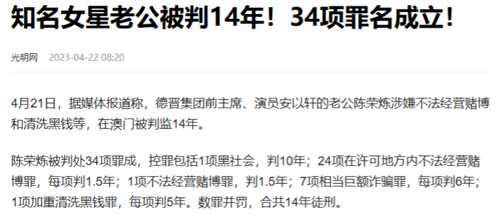 可是,好景不长。2022年,陈荣炼因涉嫌不法经营赌博和洗钱等罪名被判刑14年。这一突如其来的变故,让安以轩如遭雷击,生活水平也直线下降。曾经的"公主"一夜之间变成了独自带着孩子的单亲妈妈。