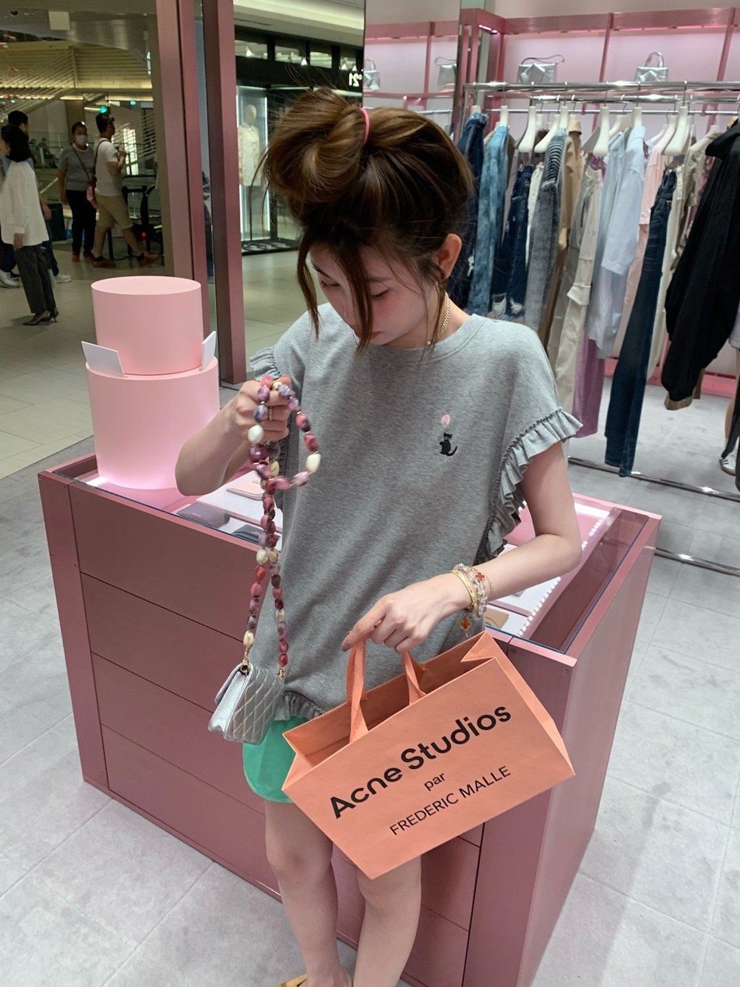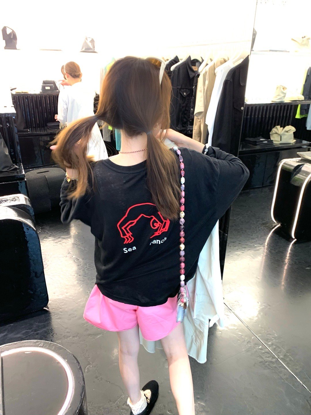 想发这件腊肠修勾一件t都是手工的 她领圈和袖边都是手工钉珠的 五颜六色的珠珠小花