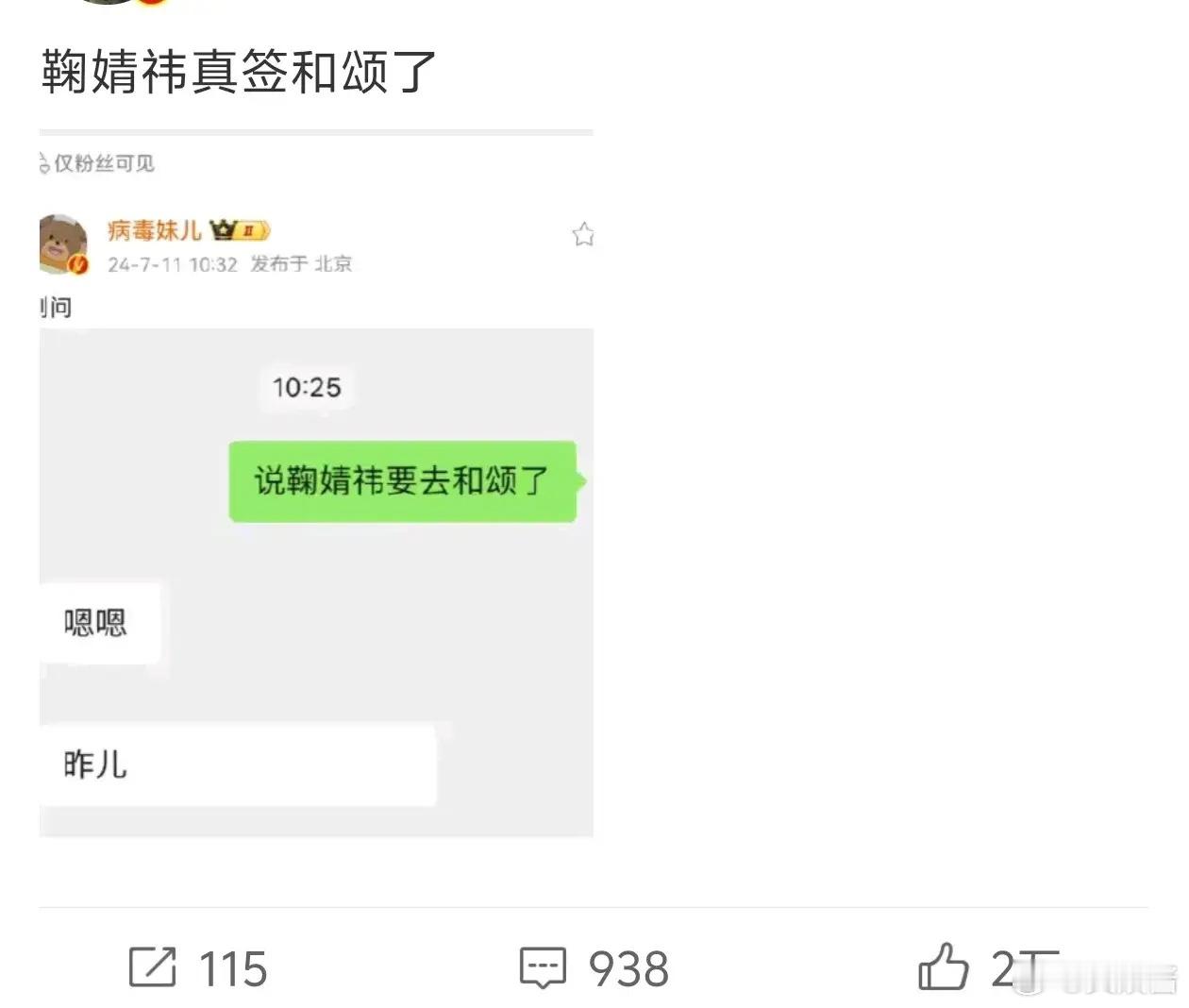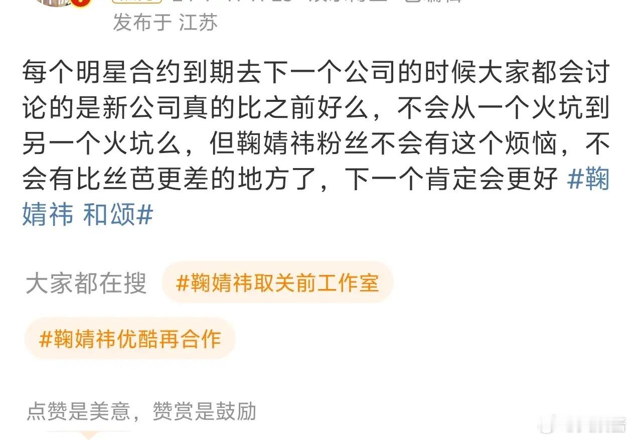 鞠婧祎已经取关前工作室了,据说昨天已经签约李冰冰的公司和颂传媒。和颂已经是她的最