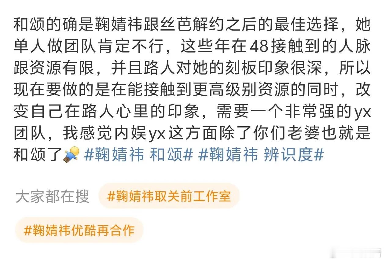 鞠婧祎已经取关前工作室了,据说昨天已经签约李冰冰的公司和颂传媒。和颂已经是她的最佳选择了,商务和公关很厉害。