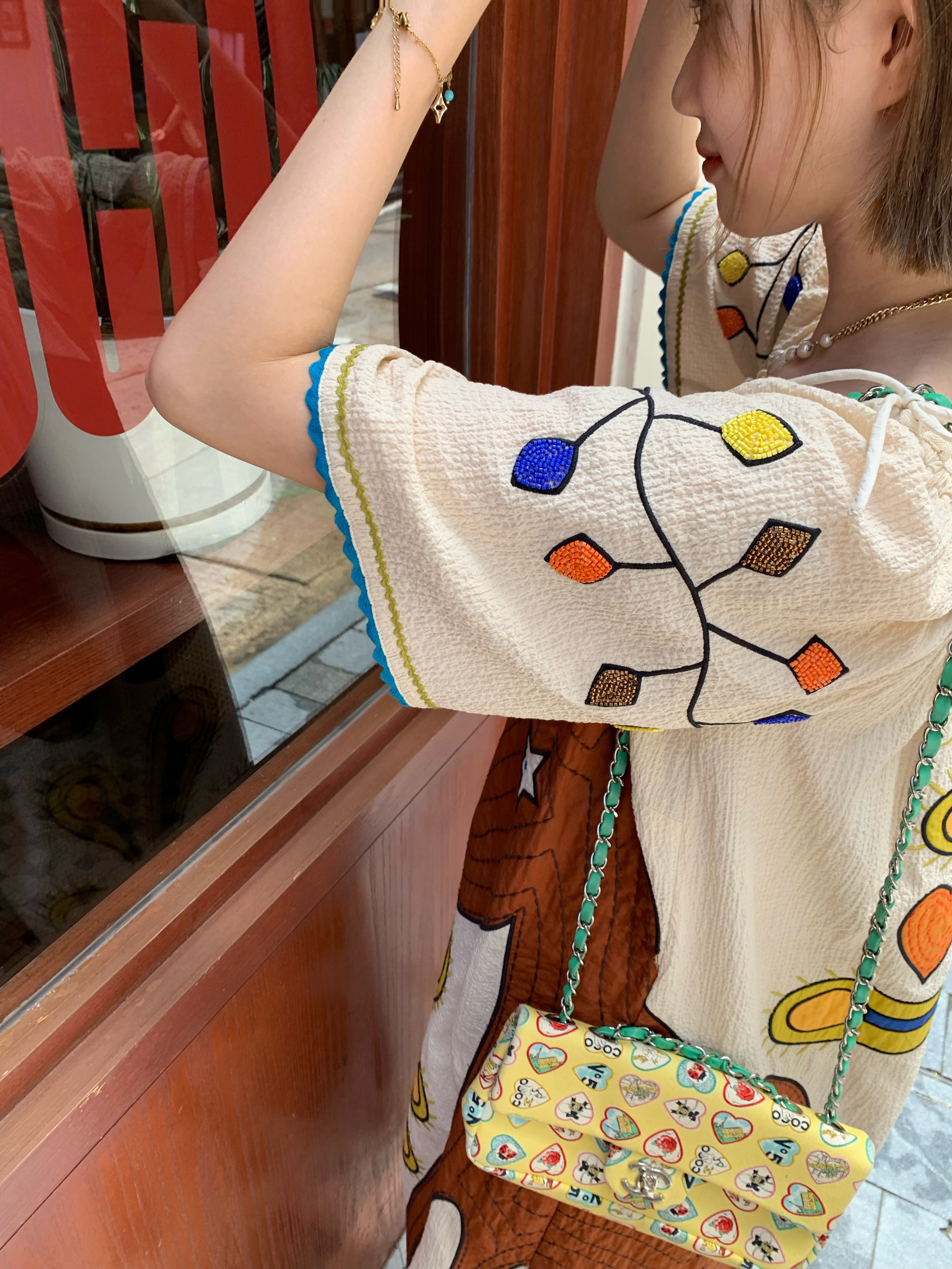 想发这件腊肠修勾一件t都是手工的 她领圈和袖边都是手工钉珠的 五颜六色的珠珠小花