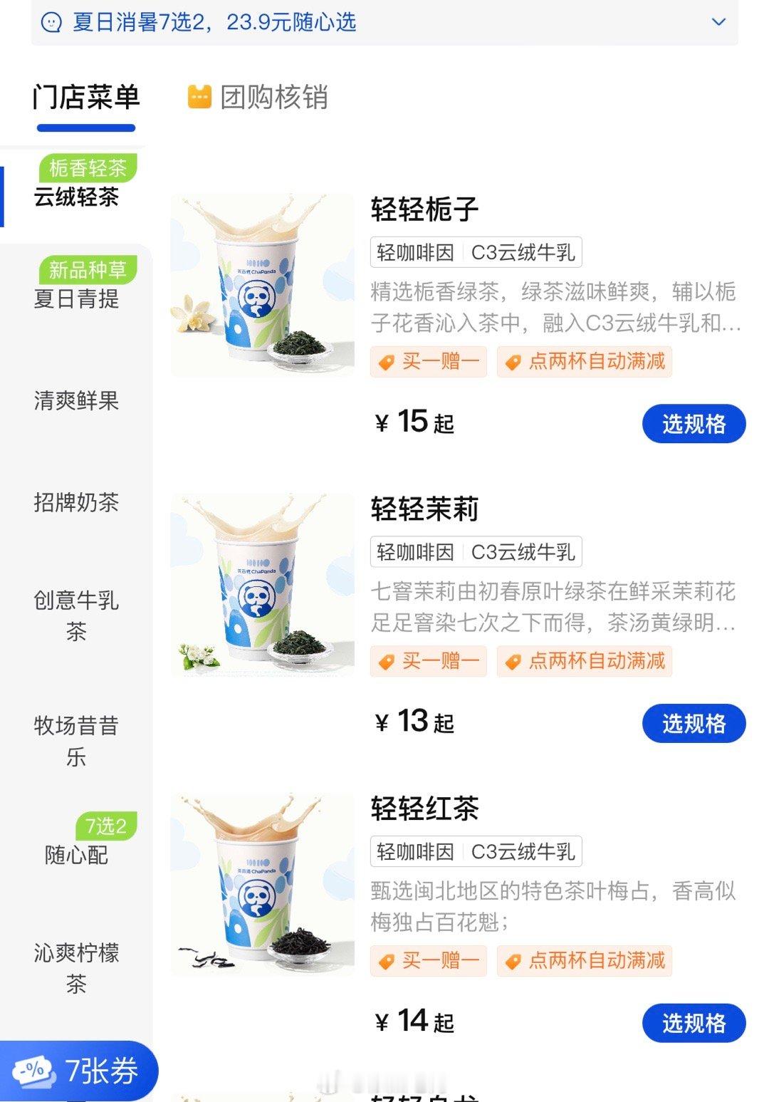 🚘暑期旅行继续,今天到了长沙。长沙可是四大火炉之一,真热啊!看到茶百道正好推出新活动,7月12日上新的云绒轻茶系列,买一送一!(图5、6)用手机点单,直接减掉一杯的价格。还可以选0卡糖,或者不添加糖。一共有5种味道,都很夏天:轻轻玫茉、轻轻栀子、轻轻茉莉、轻轻红茶、轻轻乌龙。而且无植脂末、无奶精、无反式脂肪酸,健康控糖人士就这么喝奶茶。