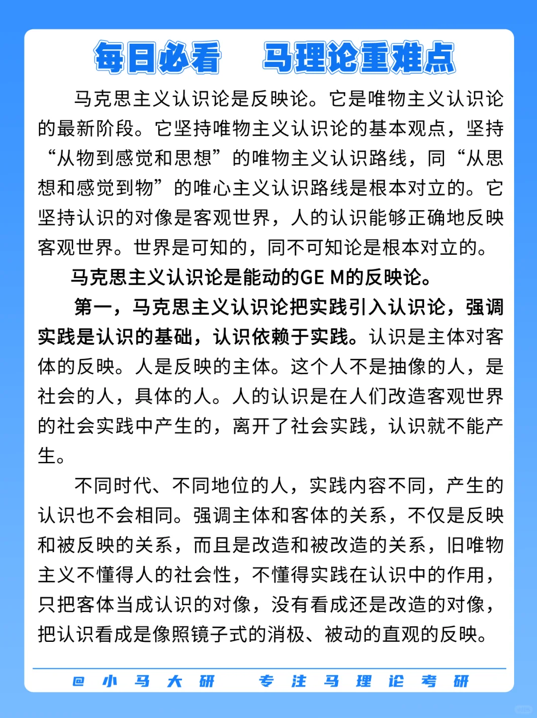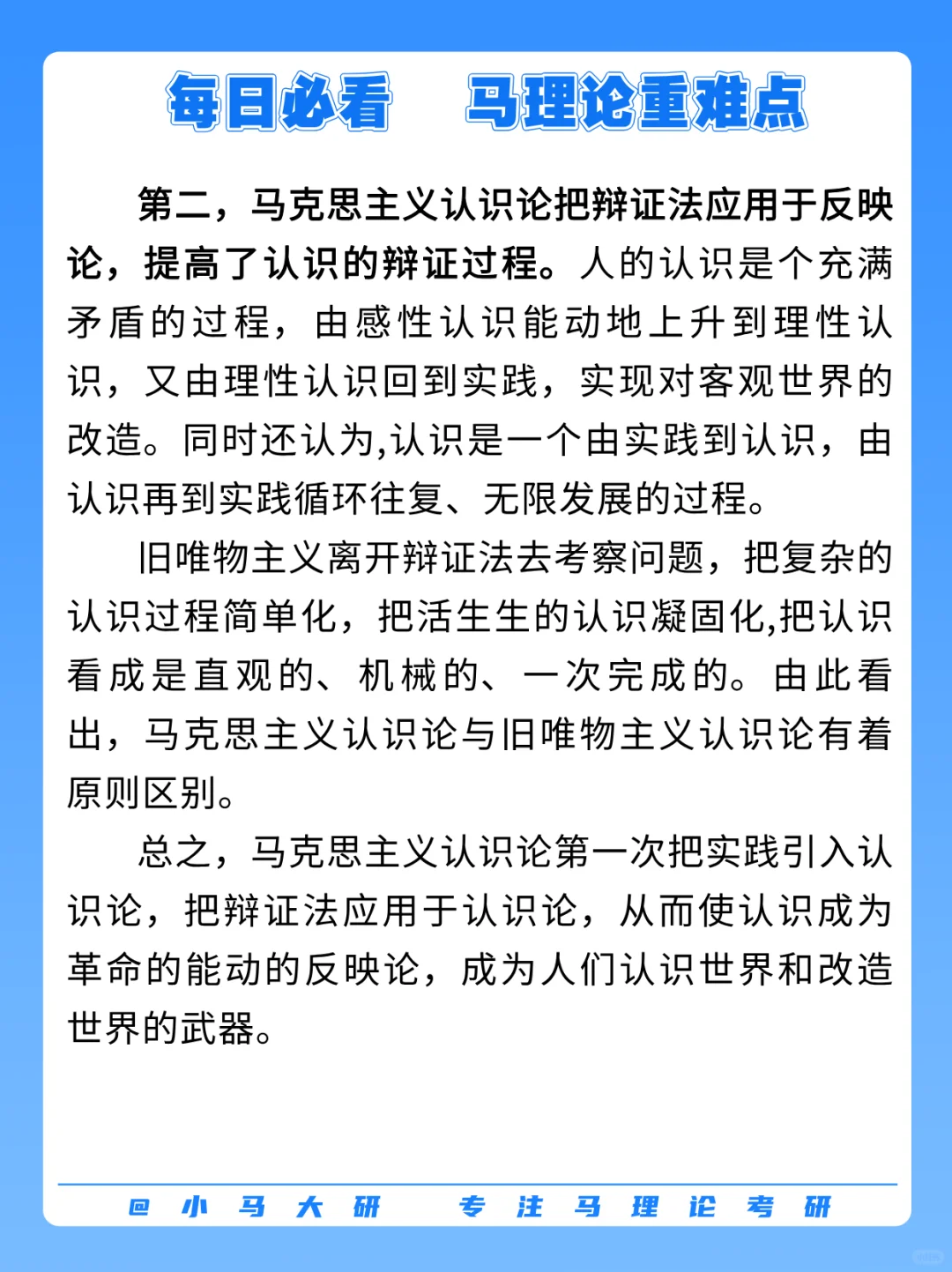 今天小马跟大家分享的是“马克思主义认识论的本质”[害羞R][害羞R][害羞R] 这个问题我们主要是要抓住“马克思主义认识论是能动的GE M的反映论。”,从“马克思主义认识论把实践引入认识论,强调实践是认识的基础,认识依赖于实践。”和“马克思主义认识论把辩证法应用于反映论,提高了认识的辩证过程。”两个出发进行阐述。[点赞R]