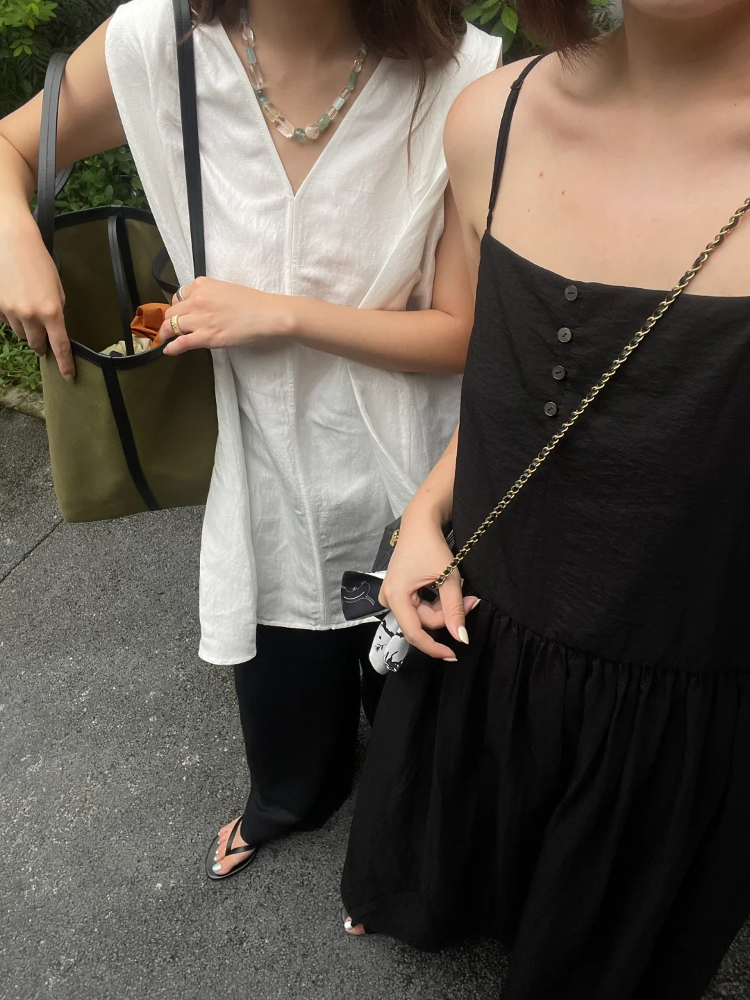 少女清新穿搭,黄色吊带裙搭配米色长裤,轻松惬意。