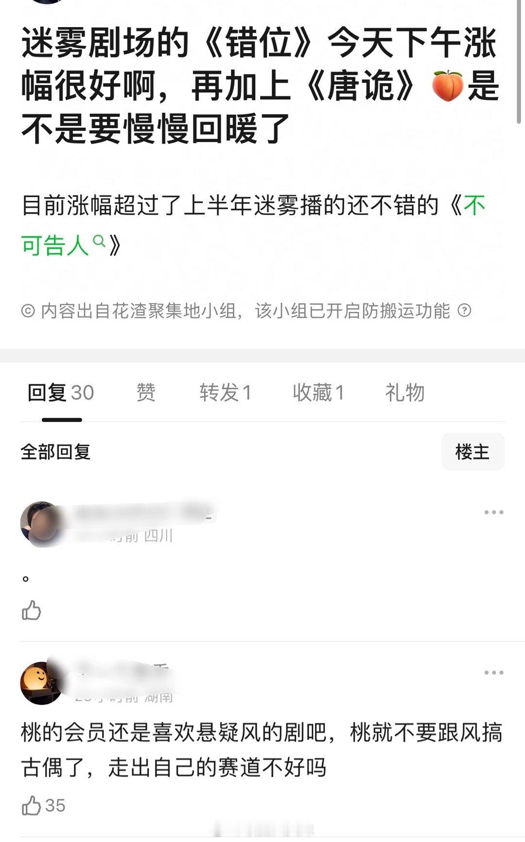 桃是不是真的要好起来了,错位热度即将破8000,更新才5集,没有流量明星粉丝刷数据,没有云包场,纯粹靠剧情,涨热度。即将接的唐诡也是悬疑,无缝衔接错位,受众一致