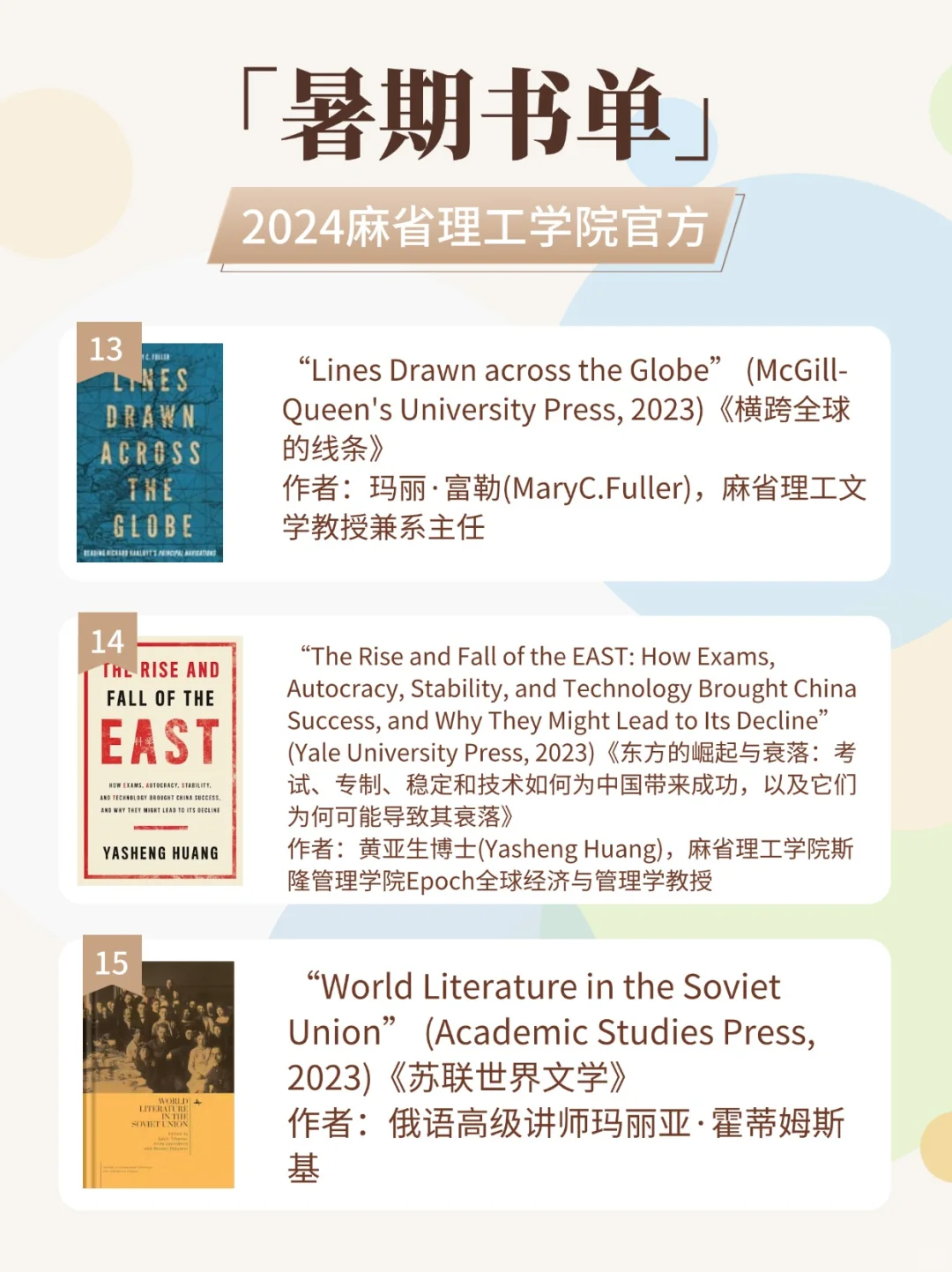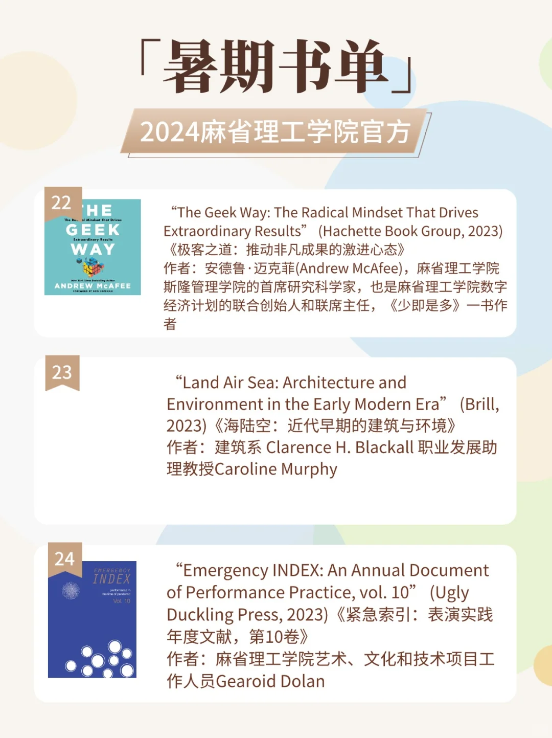 所以MIT每年的书单,都会围绕:经济、商业、媒体、科学、历史人文、艺术、环境科学、建筑、摄影等不同学科领域;以及涵盖小说、诗集、传记、科普等各类体裁等。