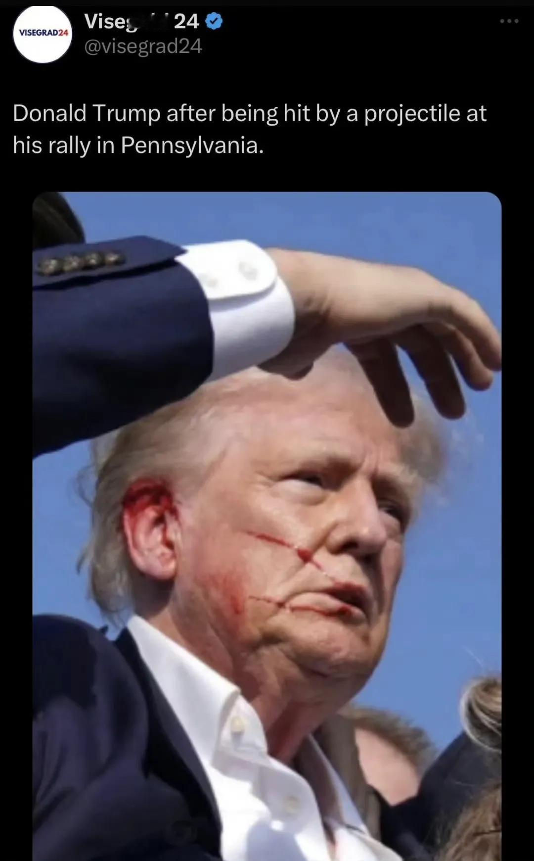 这一枪太精准了,只差几毫米特朗普就得去跟安倍做伴了。 在西方选举中,枪击事件是一把双刃剑。如果能成功地打死竞选者,那会直接破坏对方政党的大选,让己方当选概率大增。如果不能打死对方,只是受伤,那就会造成反面X效果,让对方大幅度加分,反而让遭遇枪击的一方赢得大选。 历史上,因为遭遇枪击而大获同情票赢得选举的案例比比皆是。所以,比较理智成熟的社会会唾弃任何枪击暴力行动,美国在总统大选上出现的枪击事件,恰恰暴露了美国目前发生的严重社会撕裂。 #特朗普疑遭枪击 耳朵有血迹#