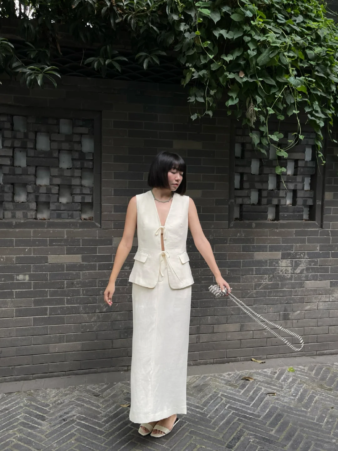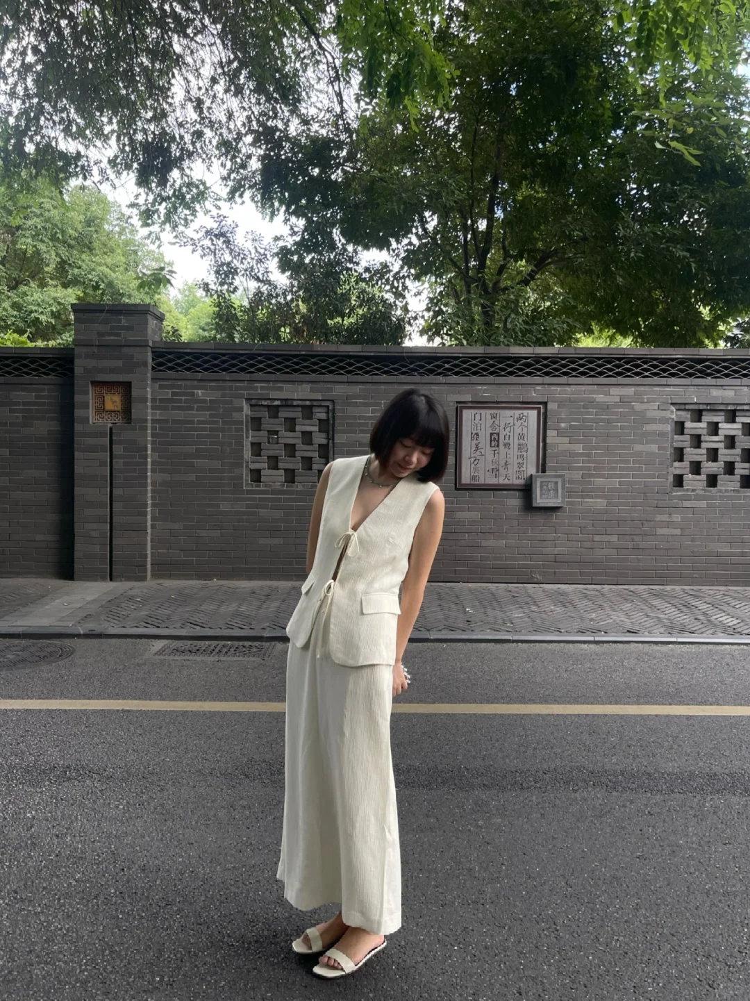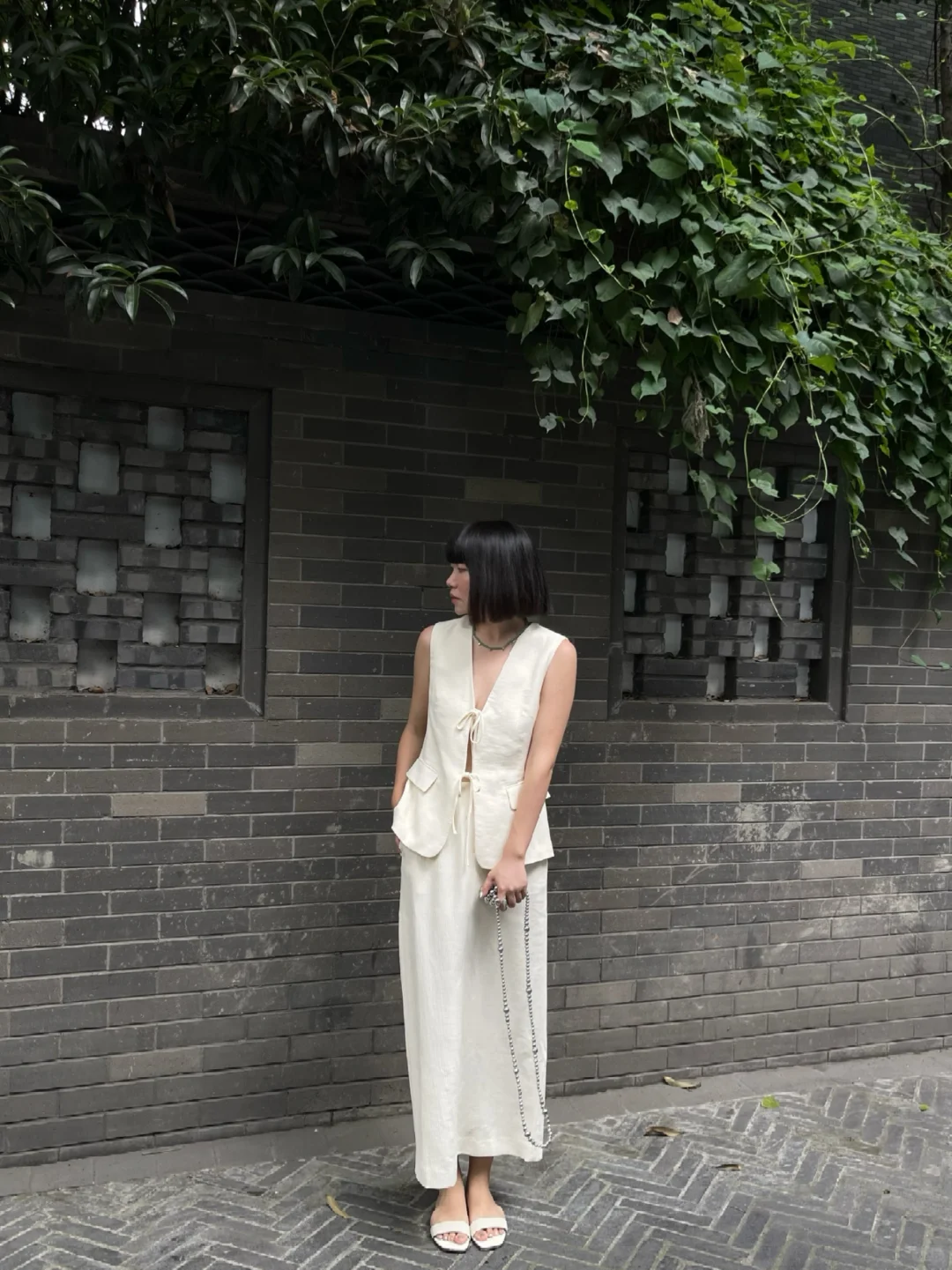 少女清新穿搭,黄色吊带裙搭配米色长裤,轻松惬意。