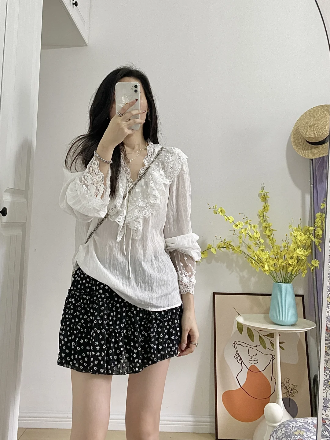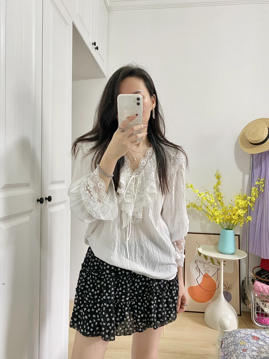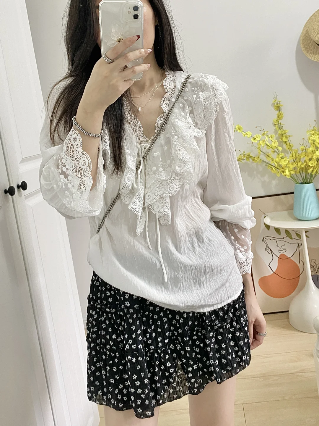 今天的这件蕾丝上衣,我超爱~是大V领,超显瘦,蕾丝、布料是人造棉(绵绸)的,是皱皱软软的感觉,超有氛国感,宫廷风,超百搭。