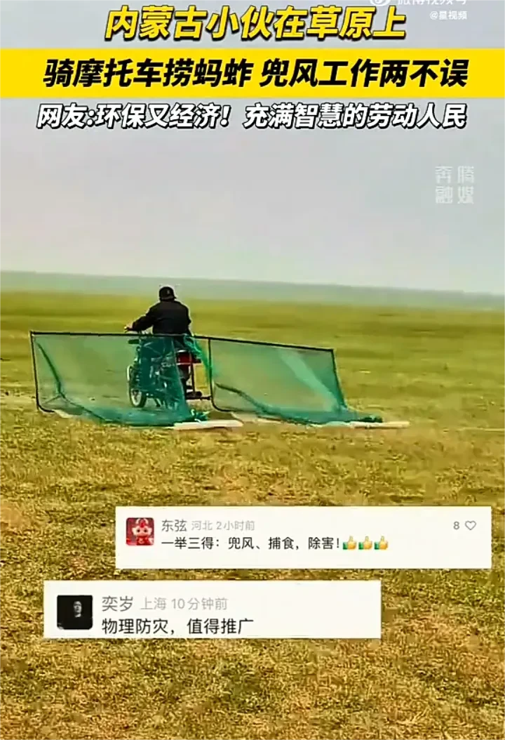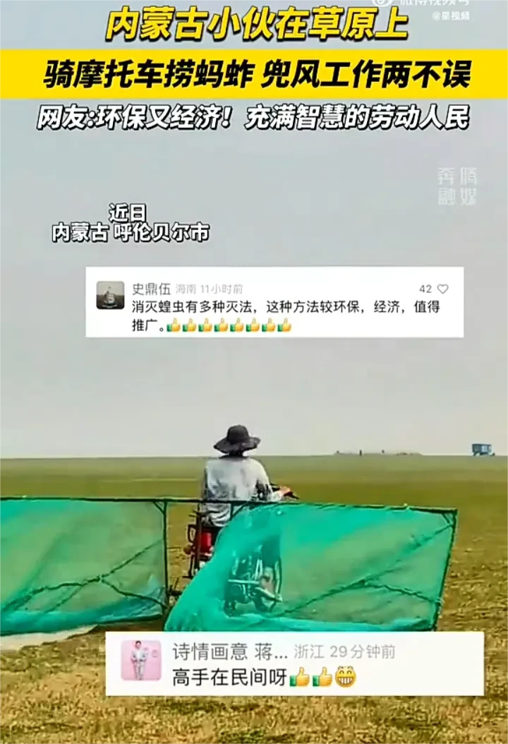 近日,内蒙古呼伦贝尔一名小伙,在草原上骑摩托车兜风,车尾绑着两个大网兜,是小伙自制的捞蚂蚱神器,不一会儿,就捞到了一大袋蚂蚱。对此,网友们纷纷表示认可,“环保又经济,兜风工作两不误。”