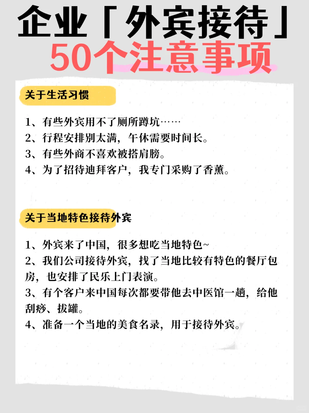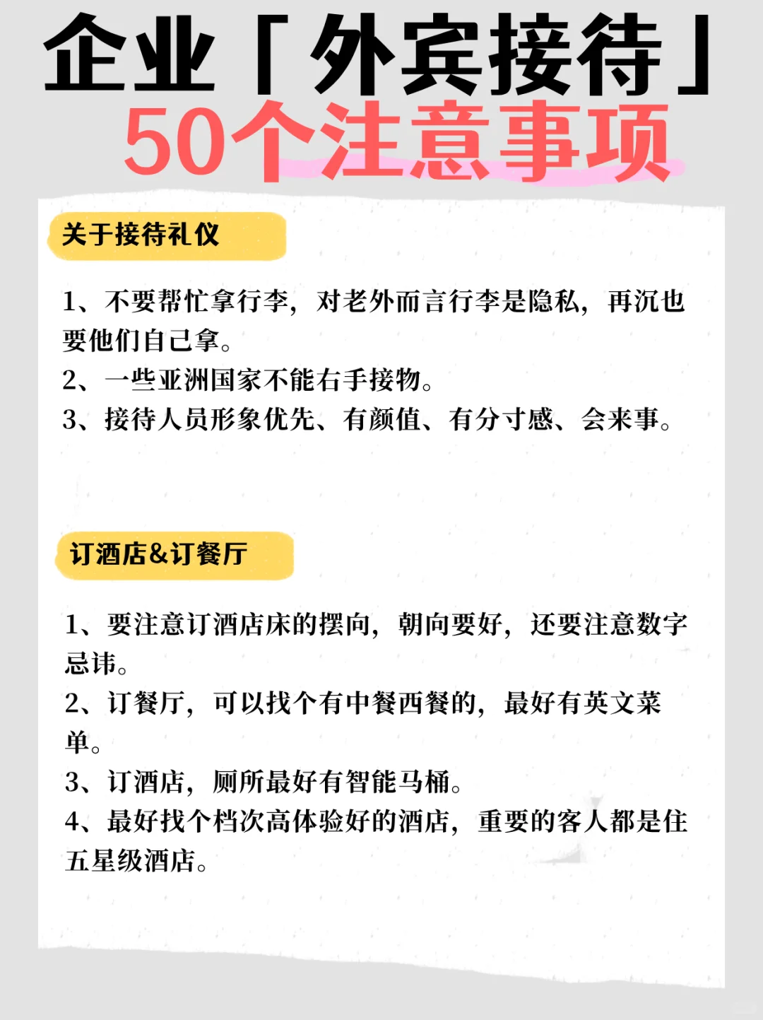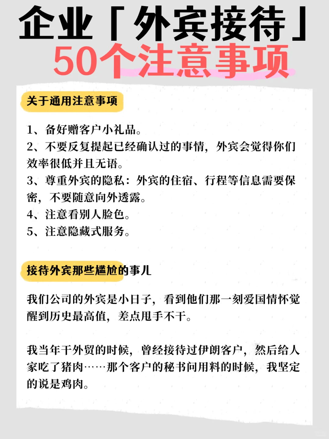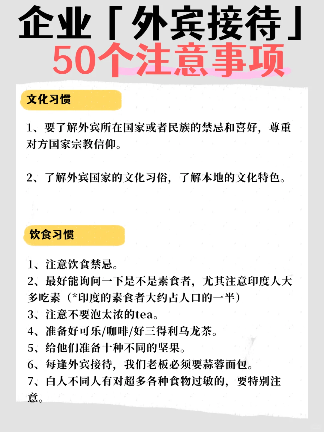 企业商务接待作为企业对外交流的重要环节,在形象塑造、业务促进、关系建立、文化展示等方面极为关键,影响企业发展,做好可以成为行政工作中一个重要的亮点。 而其中外宾接待,由于文化、习俗和语言的差异,需要我们格外注重礼仪细节,以确保接待工作的顺利进行,给外宾留下良好而深刻的印象。