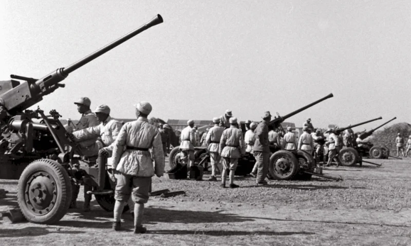 图7:1948年,山西阎锡山部正向《生活》杂志记者展示自己的重型武器。抗战结束后,阎锡山大肆改编和留用日伪。到晋中战役爆发前,他麾下已有3个集团军以及总队、保安团、警备大队等诸多部队,总兵力约13万人