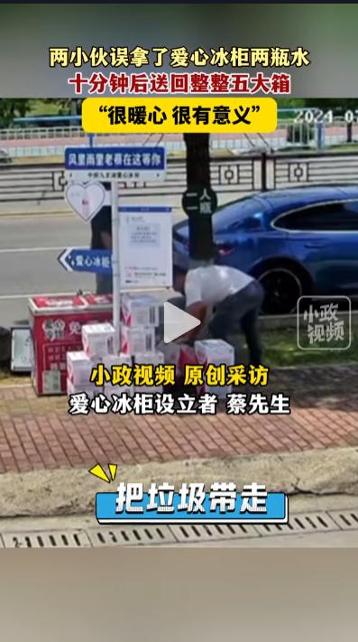“这两个大哥,你们火了!”浙江温岭,两个大哥错把爱心冰柜当售卖机,从里面一顿取饮料喝,等到发现后还是没有掏钱,开车扬长而去...但令人没想的是,十分钟后又回来了,这一次他们的行为感动了亿万网友! (信息来源:小政视频2024.7.15 浙江温岭,两小伙误拿爱心冰柜两瓶水,十分钟后送回整整五大箱) 炎炎夏日,当我们躲在空调房中惬意的享受舒适时,街边的环卫工、交警、快递小哥们还在不停的忙碌着,为了预防他们中暑,为这些辛劳的人总去一份慰藉。 近日,一种特殊的冰柜出现在浙江温岭的路边,上面写着“爱心冰柜,免费自取”等字。原来,这是城市特地为户外劳动者提供的免费饮品。里面的饮料不仅保持冰冻,而且还有一次性杯子整齐的码在一旁,方便环卫工人取用。 这天中午,天上热的仿佛在流火,两个口干舌燥的大哥来到冰柜前,取出冰水就往嘴里倒。“咕咚咕咚”那叫一个痛快,冰水带来的刺激瞬间驱散了身心的燥热。 然而当两人离开,准备扫码付款时,意想不到的一幕发生了,机器上没有张贴任何付款码。“怎么会这样,商家忘了?” 找着找着,两人的眼睛不约而同被“爱心冰柜 免费自取”八个字吸引了,下一秒,他们的脸上露出了不好意思的表情,转身开车扬长而去。 本以为他们捡了便宜就跑了,岂料十分钟后,两人又重新来到了冰柜前,打开汽车后备箱,就开始往外搬矿泉水,一箱,两箱,整整五大箱! 二人不顾天气闷热,耐心的撕开包装,将矿泉水整齐的装进冰柜里,直到塞得满满当当,才对视一眼,心满意足的离开了。 让人动容的是,为了不给环卫工添加负担,连剩余的包装袋都打包带走了。刚巧,两人的善举被冰柜的“主人”蔡先生录了下来,那天他本打算去添货,没想到打开后,饮料不仅没少,还多出了一些,于是打开监控,目睹了这一切。 其实,据爱心冰柜的发起人透露,像两位小伙这样的好心人,还有很多,他们总会自掏腰包,给冰柜加满,事后悄然离开,争当无名英雄。 目前,爱心冰柜已经在北上广深等一线城市陆续铺开,它的出现,缓解了高温环境下户外工作人员的压力,同时,还代表着城市的良心。 以它为媒介,衍生出了一个个动人的故事,见证了无数善良的瞬间。如果哪天 ,你在街头发现了它,若条件允许,可以往里面加几瓶书,说不定,你的善行会让一位环卫工在闷热的午后得到一丝清凉,为你所在的城市增添一份信任和温情。