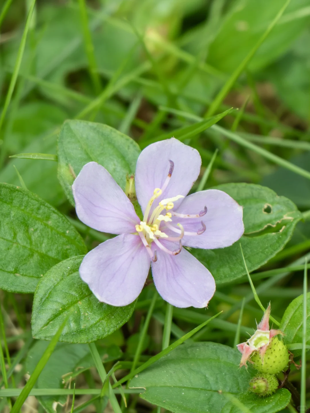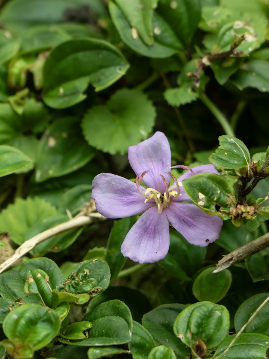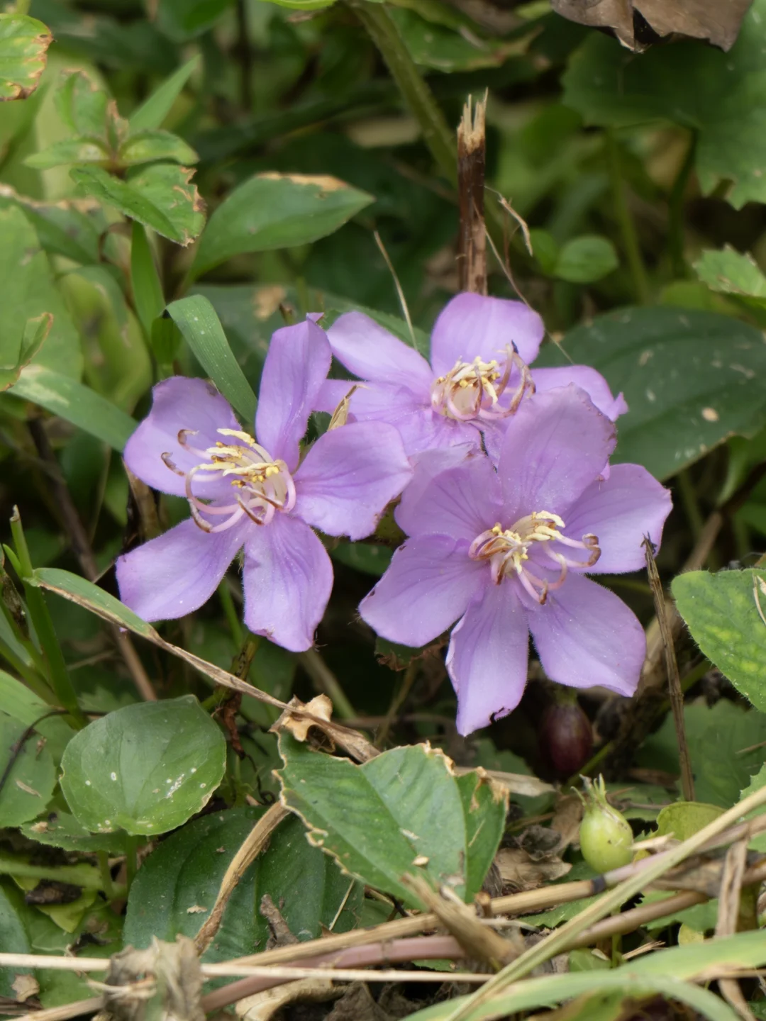 地棯,一种属于夏天的花,当然其他季节偶尔也能看到它绽放。它算是野牡丹家族的小个子,低入尘埃,绿色的叶子就好像是给大地去铺上了一层绿色的地毯,在山野里也随处可见。 每年七月,地棯淡淡的紫红色的花朵星星点点的点缀在绿色的地毯上,仿若是大地最美的微笑,一路延伸着,延伸着,铺满了整个七月的夏天。