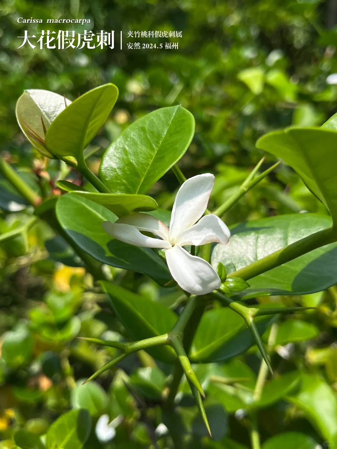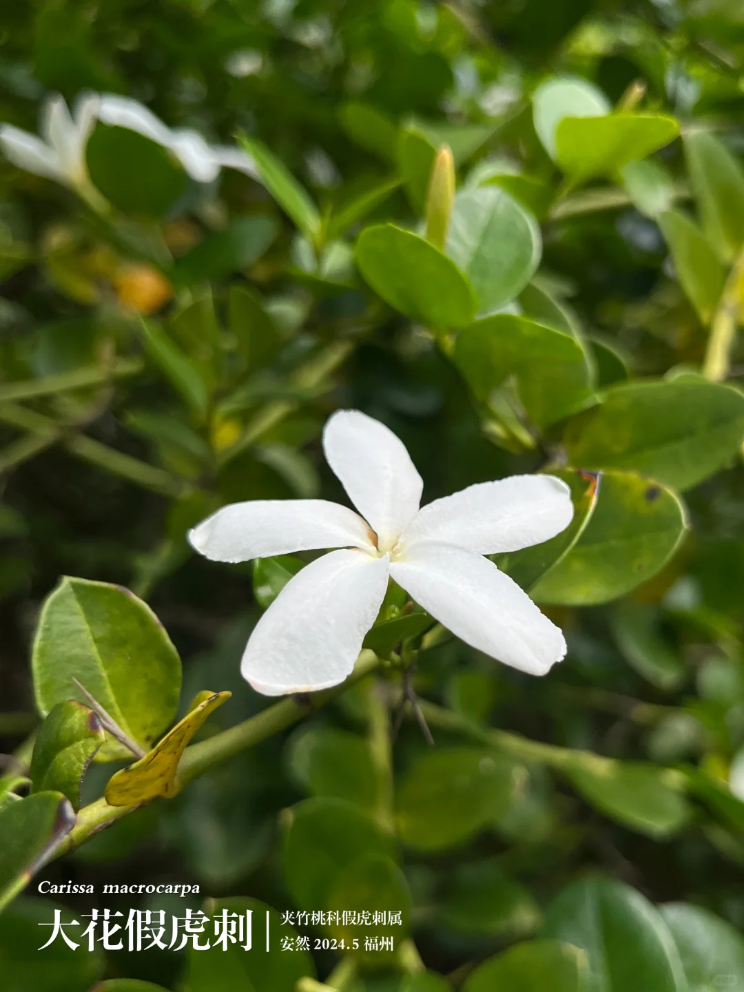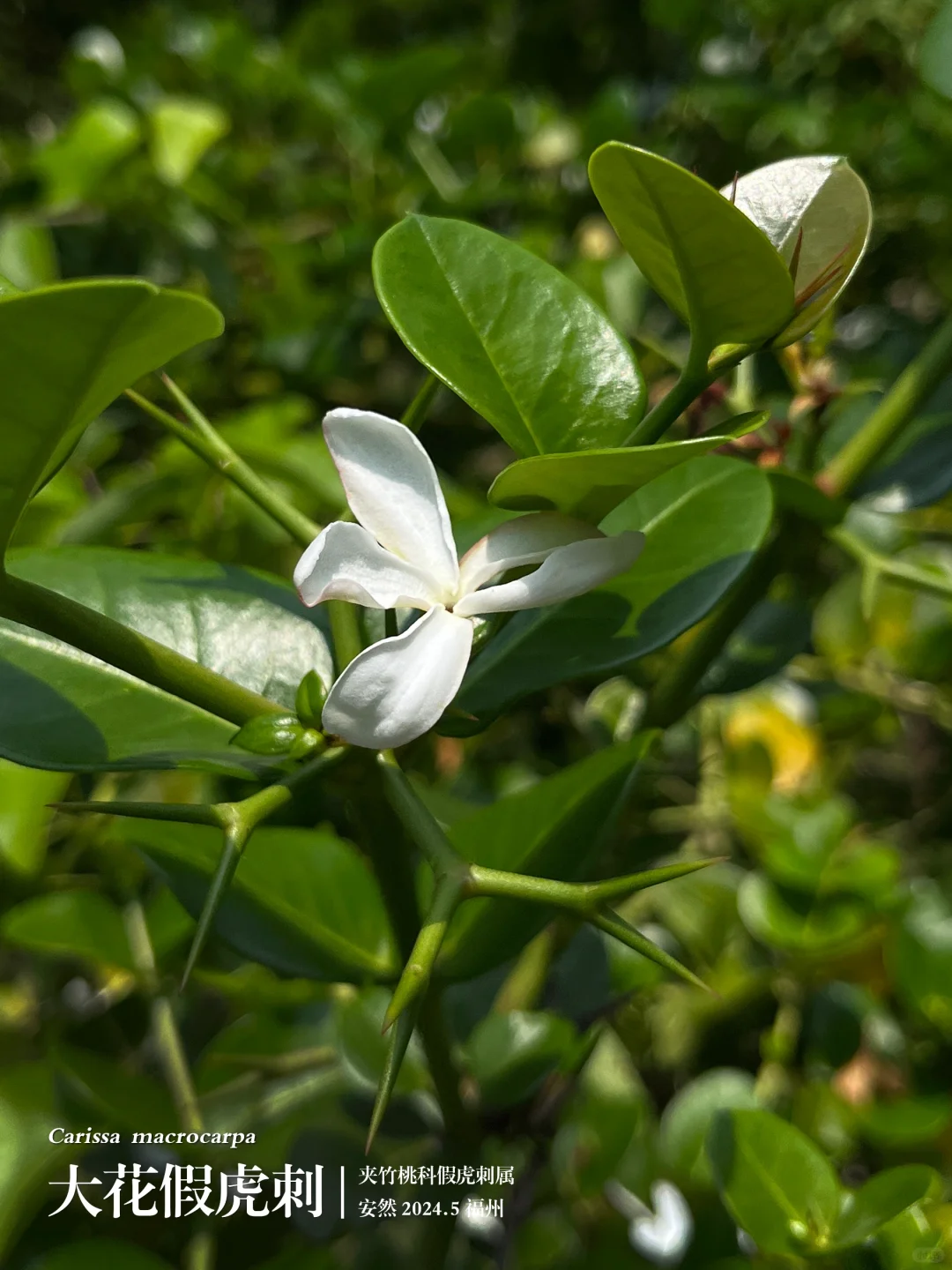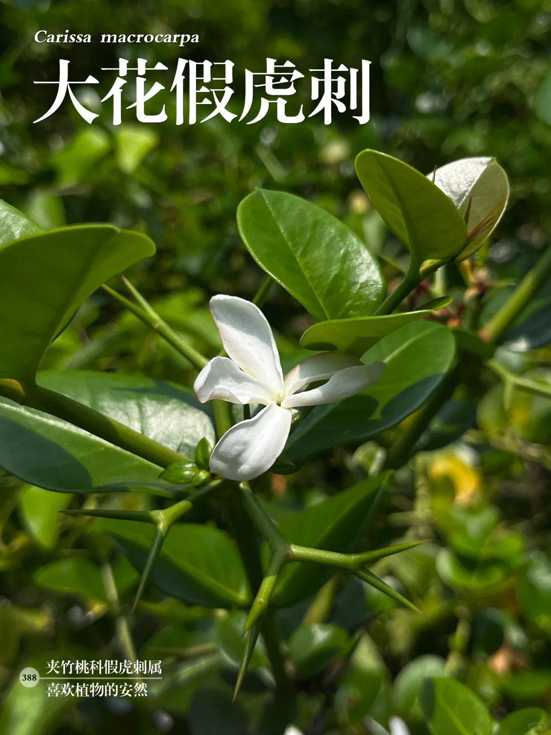 因为开白花,都有点像茉莉花。仔细看,区别还是蛮大的。大花假虎刺的枝条上有绿色的小刺,刺还是“丫”字型,仿佛伸出无数个小叉叉,守卫花木,所以类似铁海棠的叫法,叫铁茉莉。