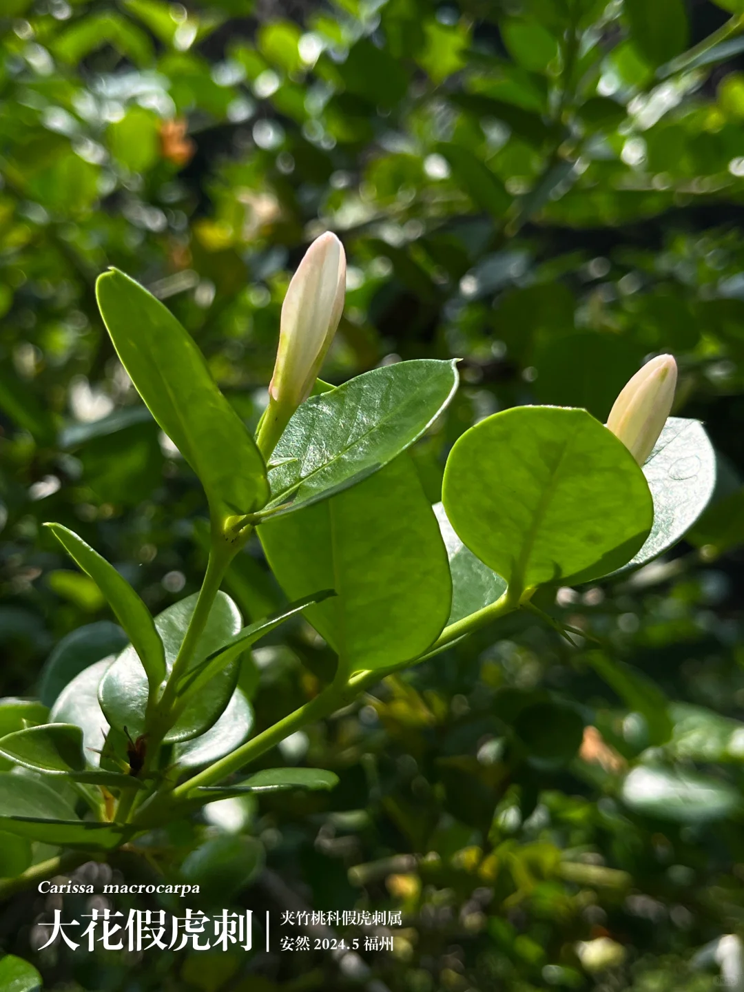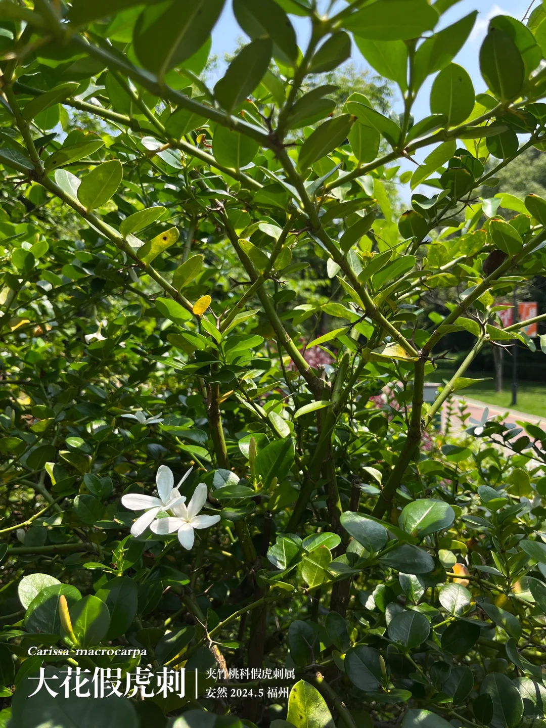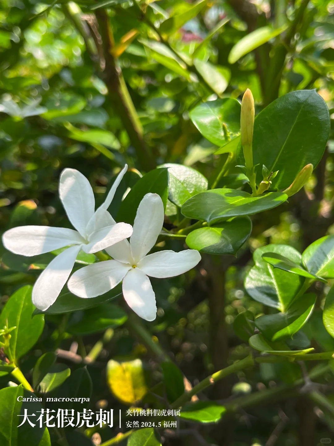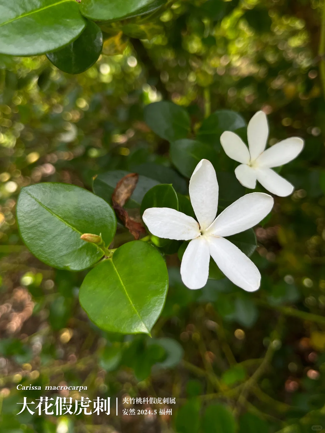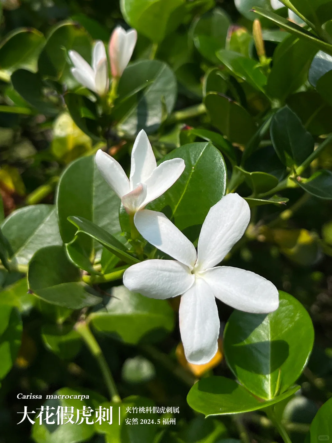 因为开白花,都有点像茉莉花。仔细看,区别还是蛮大的。大花假虎刺的枝条上有绿色的小刺,刺还是“丫”字型,仿佛伸出无数个小叉叉,守卫花木,所以类似铁海棠的叫法,叫铁茉莉。