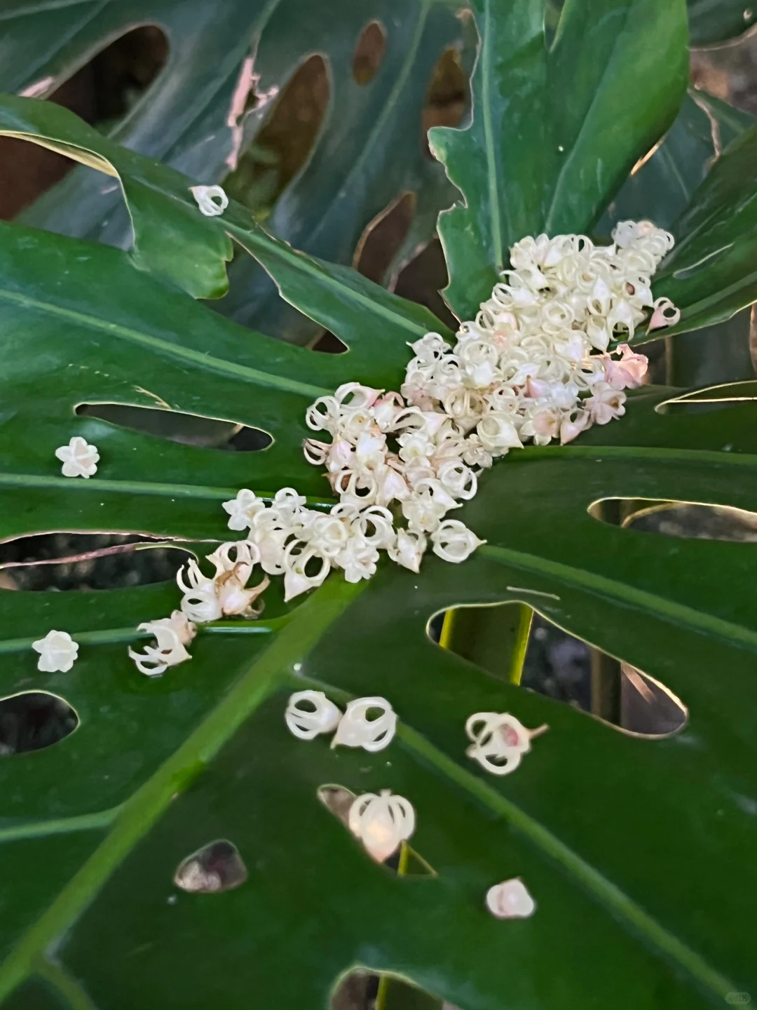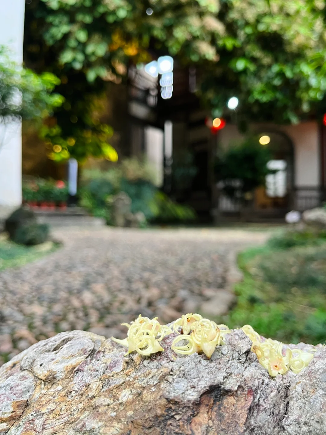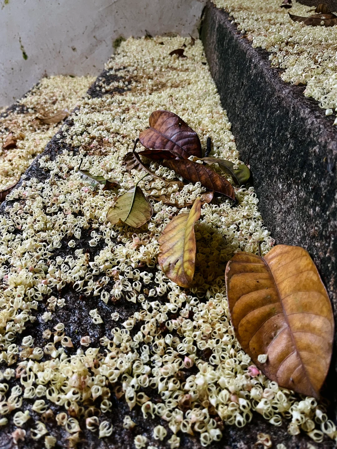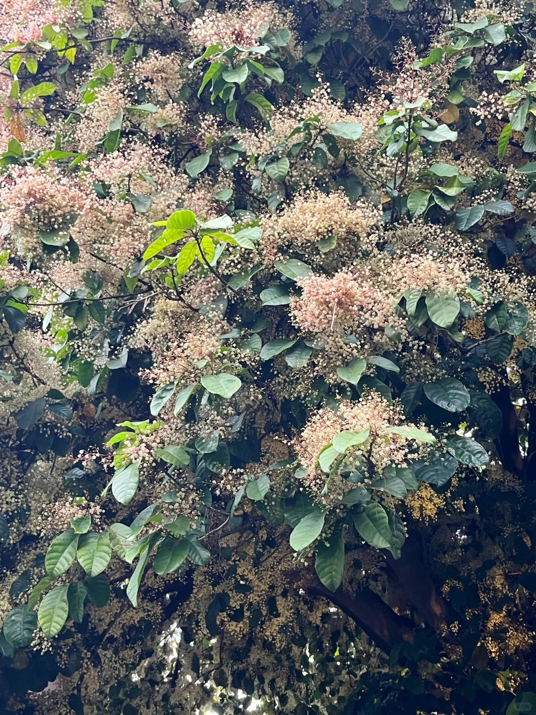 此刻正是苹婆开花的季节。苹婆花仿若成串粉白色小灯笼,微风拂过,花如雨落,别有一番风味。树下落花无数,地面仿佛铺满一层雪。