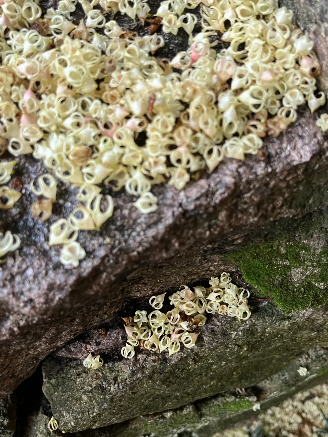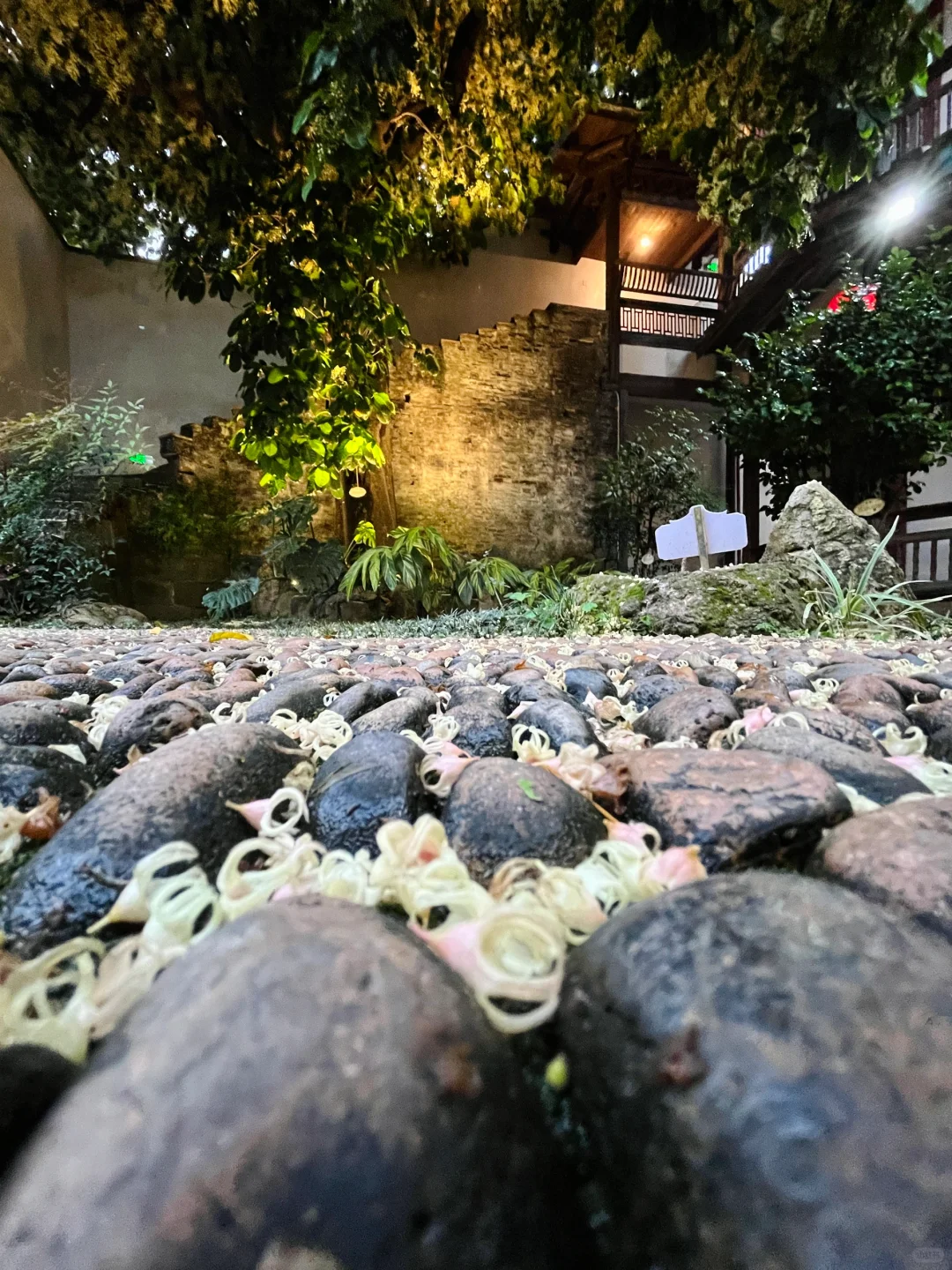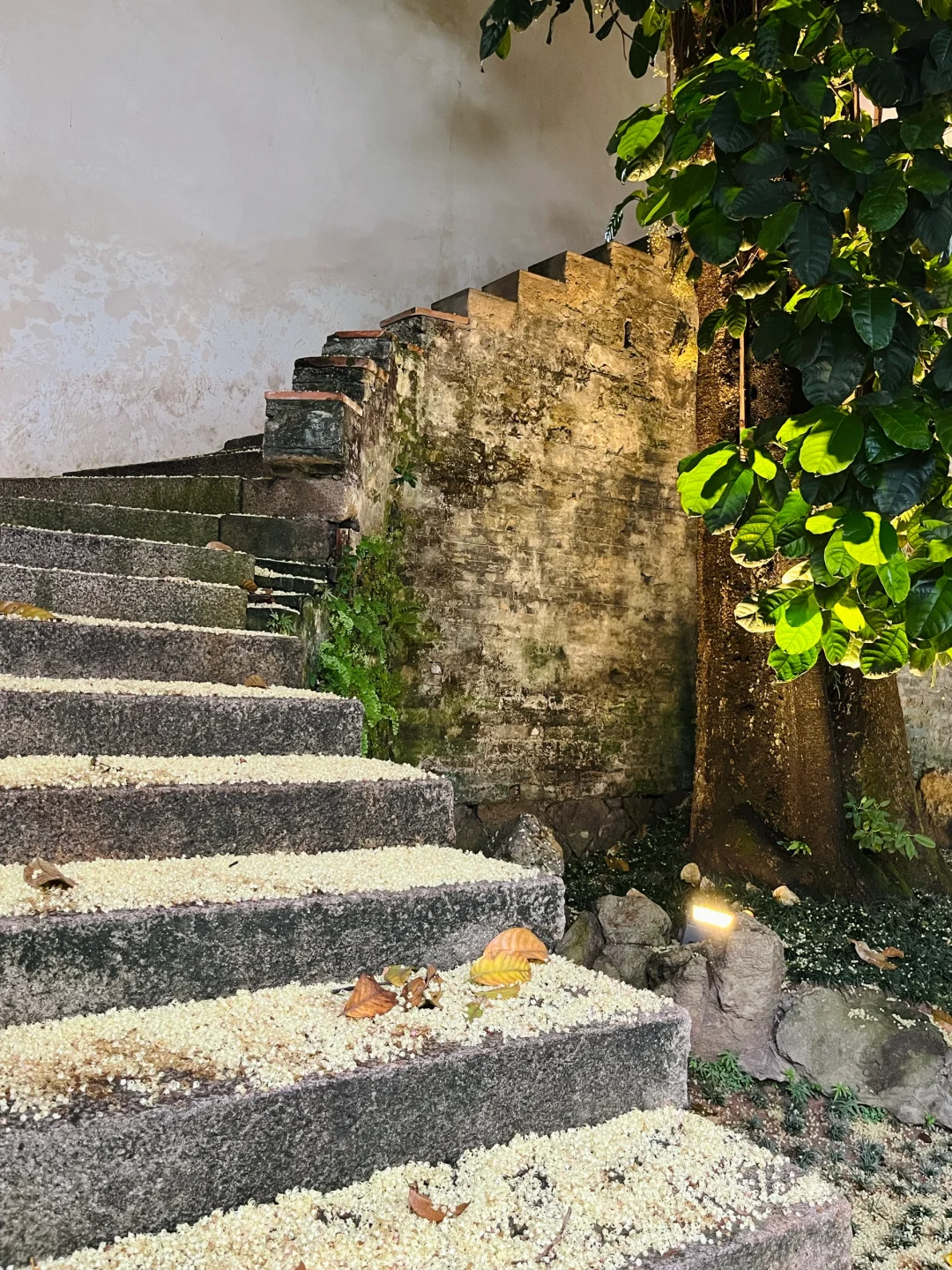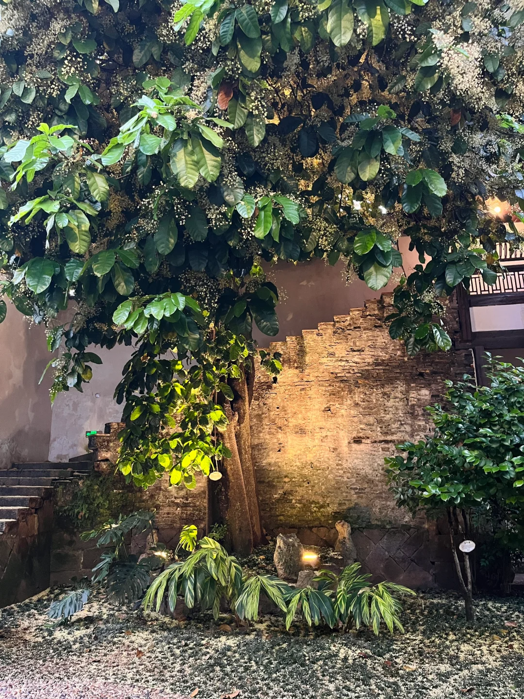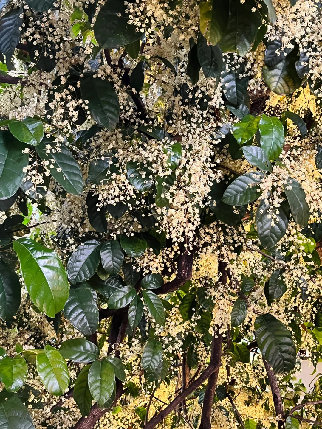 此刻正是苹婆开花的季节。苹婆花仿若成串粉白色小灯笼,微风拂过,花如雨落,别有一番风味。树下落花无数,地面仿佛铺满一层雪。