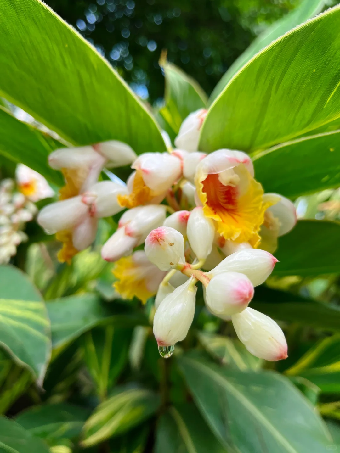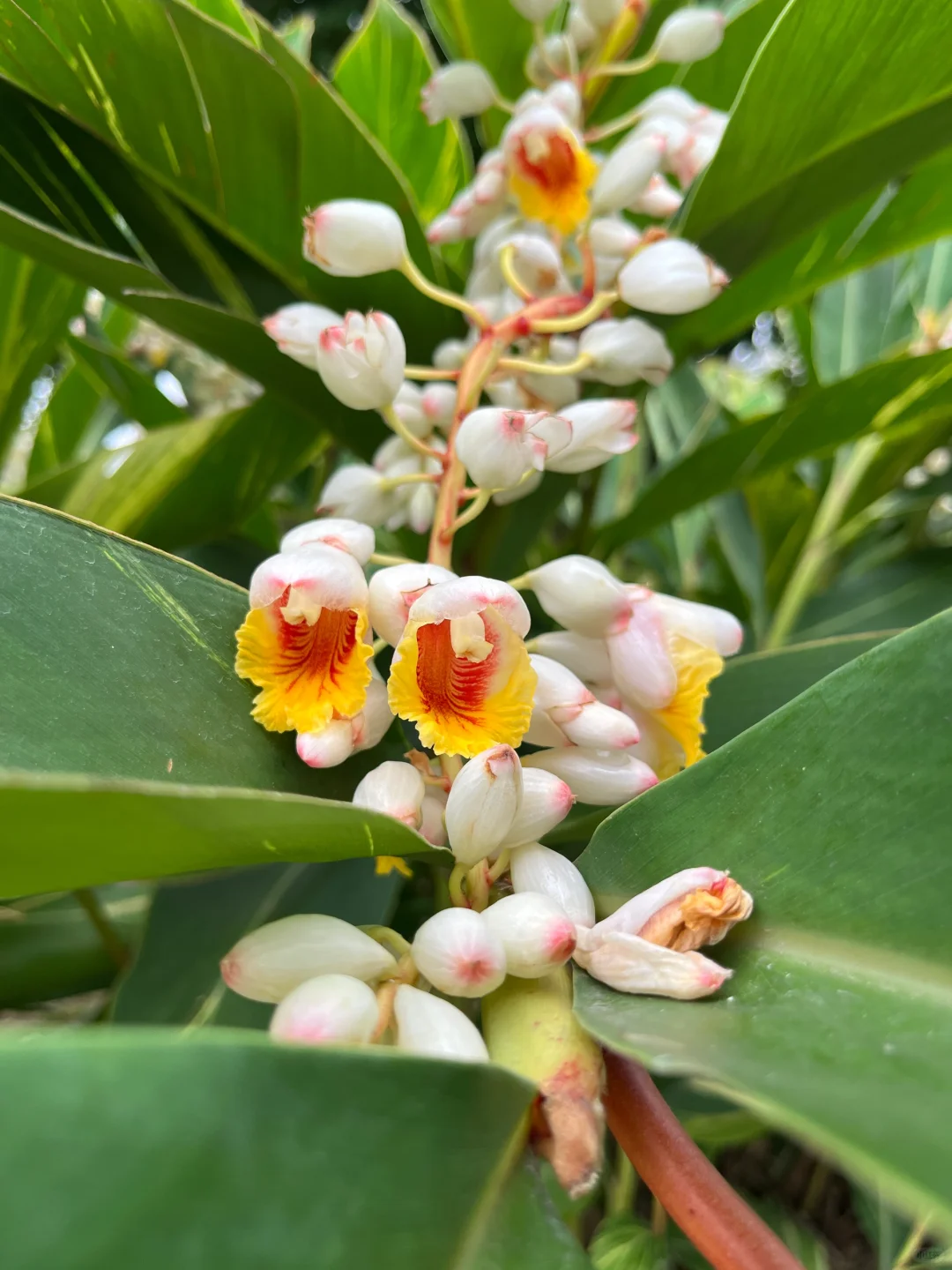 艳山姜的花苞形如桃,洁白如玉,最早收载它的清代《植物名实图考》称其为“玉桃”:“玉桃,叶如芭蕉,抽长茎,开花成串,花苞如小绿桃,花开露瓣,如黄蝴蝶花稍大,偶一有之,故人罕见。”