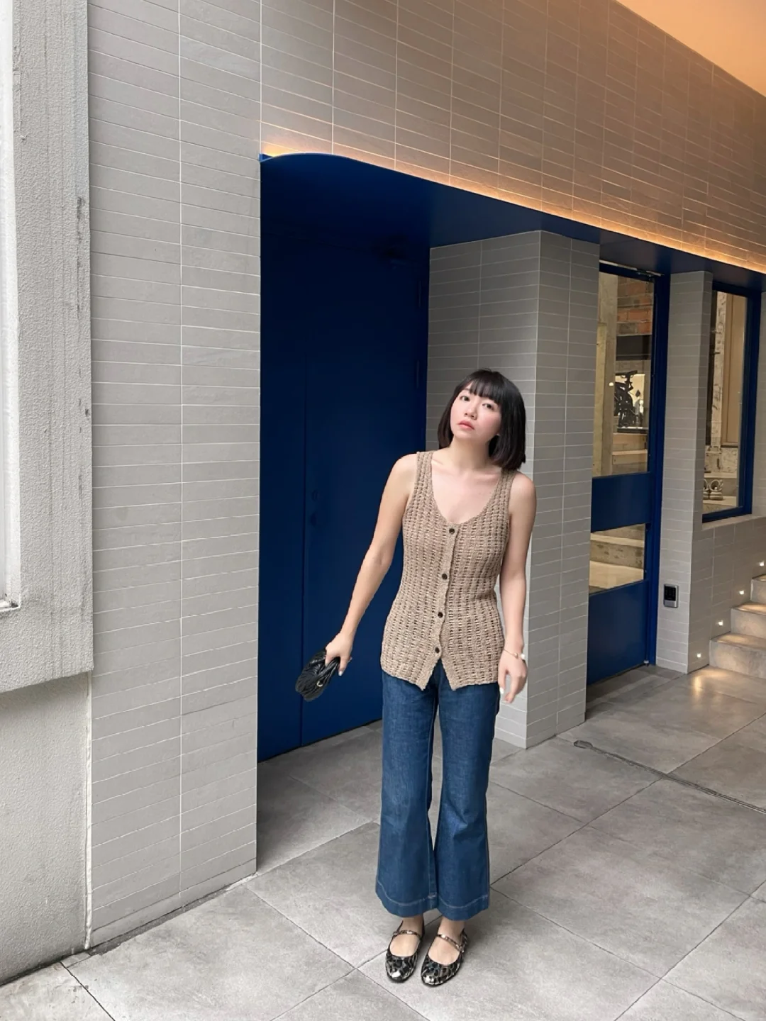 1. 体型:身材高挑,曲线玲珑,整体身形匀称且线条优美,高腰喇叭裤更凸显出腿部与