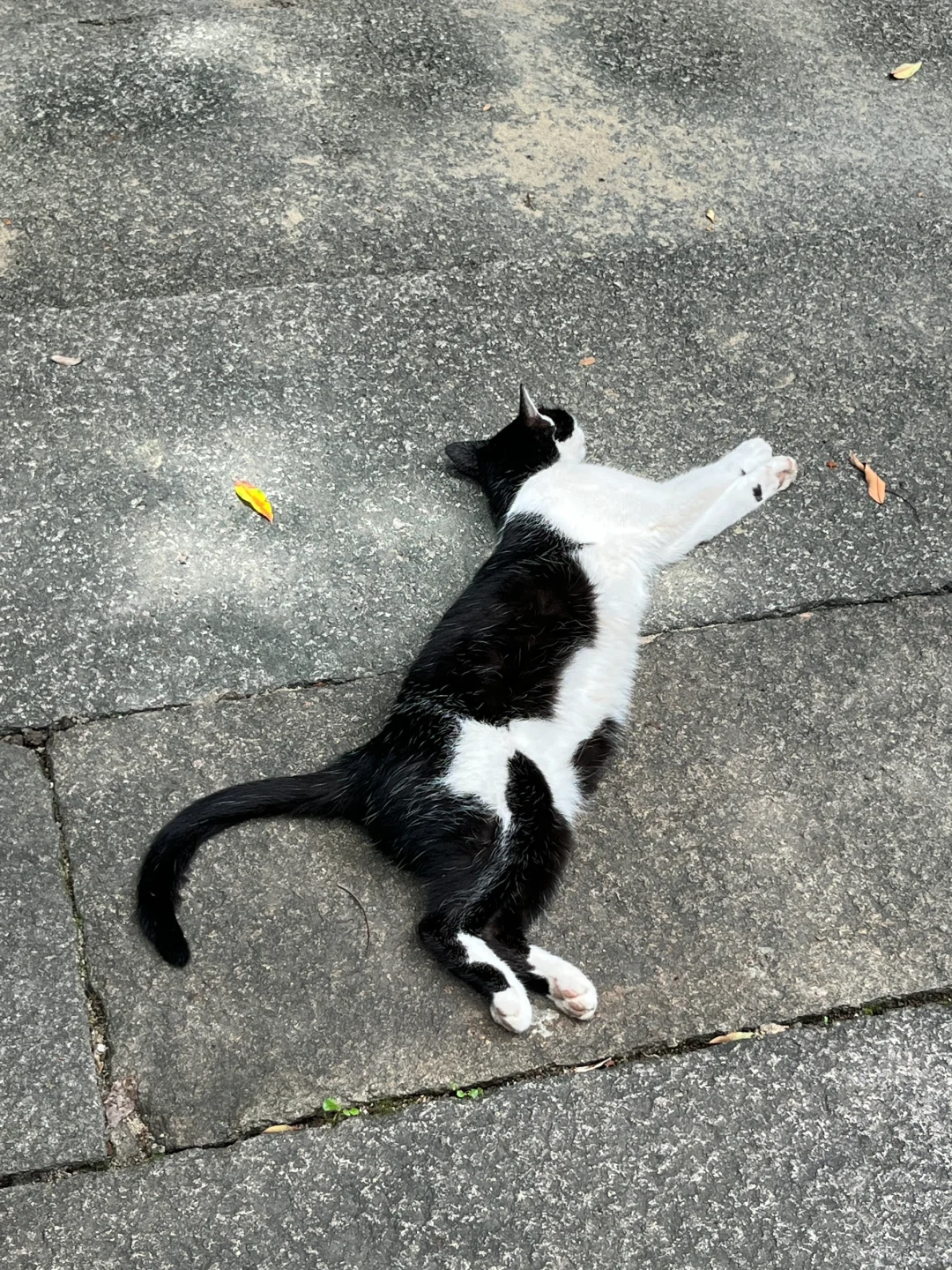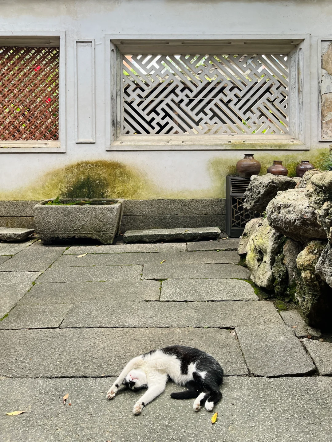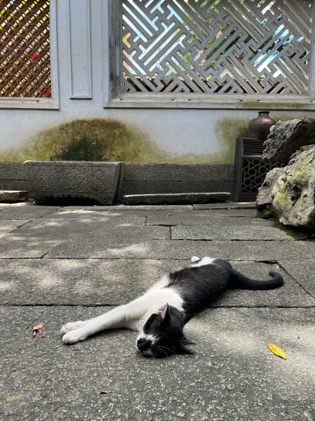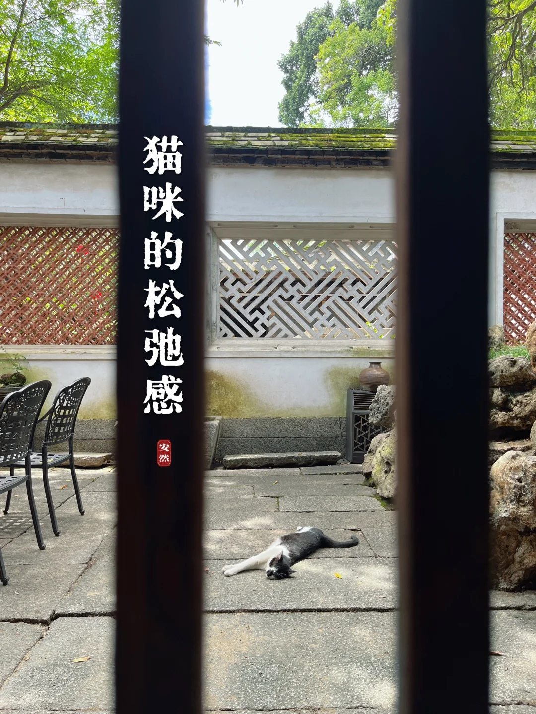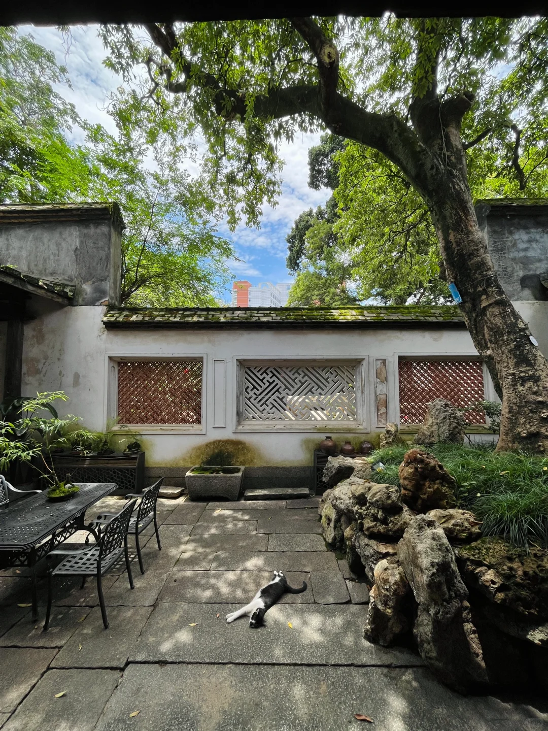 论猫咪刻在骨子里的松弛感——— 久雨初晴的午后,我信步走进福州朱紫坊内的芙蓉园(福州四大园林之首),拜访园中300余年历史的古荔枝树。 荔枝树正在果熟期,离大红尚有时日。 树下,偶遇一只慵懒的猫咪。它正四仰八叉地躺平在树阴中,紧闭双眼,尽情陶醉在多日不见的阳光里,享受属于它的午后闲暇时光。 安宁的氛围,让我忍不住停下脚步,记录下它从容的猫生,一并享受这份宁静。 猫咪对于我的到访及拍摄毫不在意,只顾睡懒觉。自我走进院子直至走出院子,它仅仅只是翻个身。 这小日子,过的可真惬意啊!