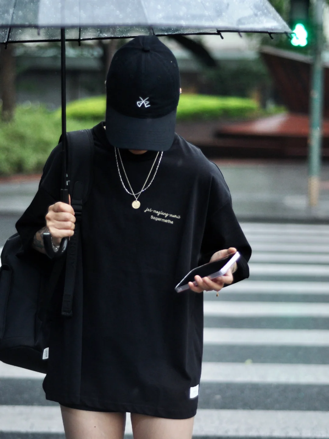 夜晚的都市街头简直是拍照的宝藏地。前几天我就看到一个黑衣少女在街头自拍,那时尚感