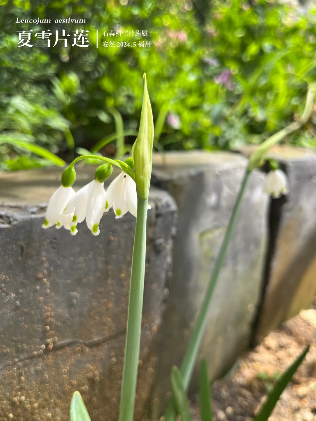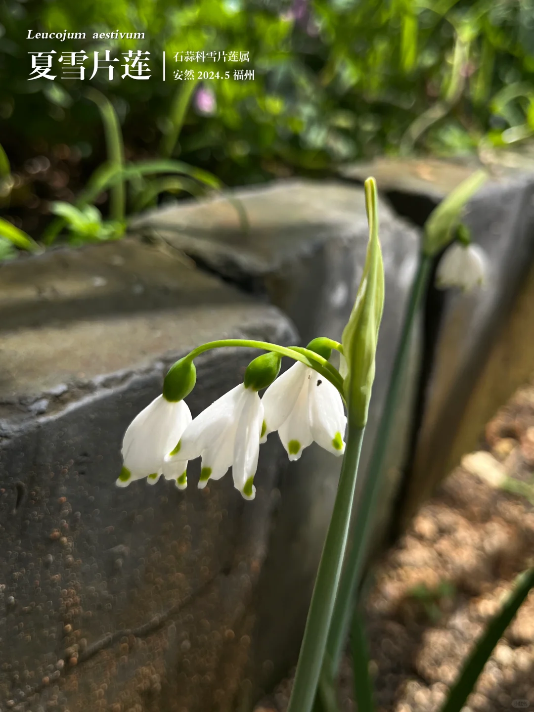 我以为是铃兰,查资料发现叫夏雪片莲,很特别的名字。细看白色花瓣的边缘,还点缀着多个绿色斑点,美丽的像仙女裙。