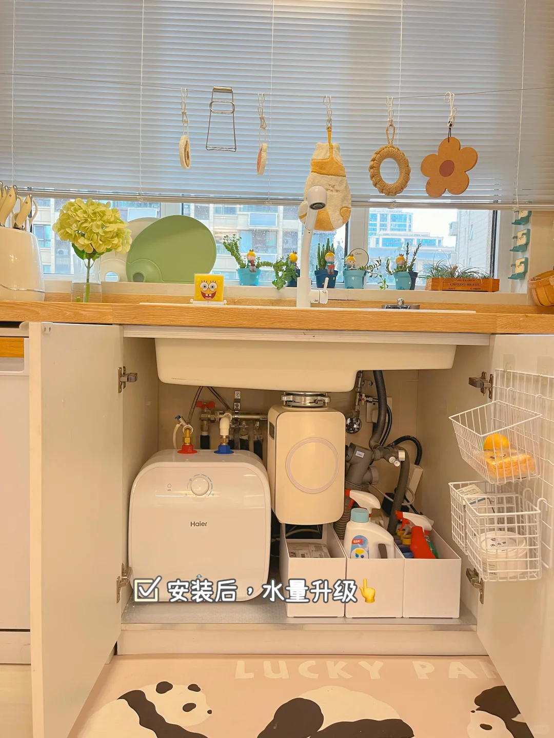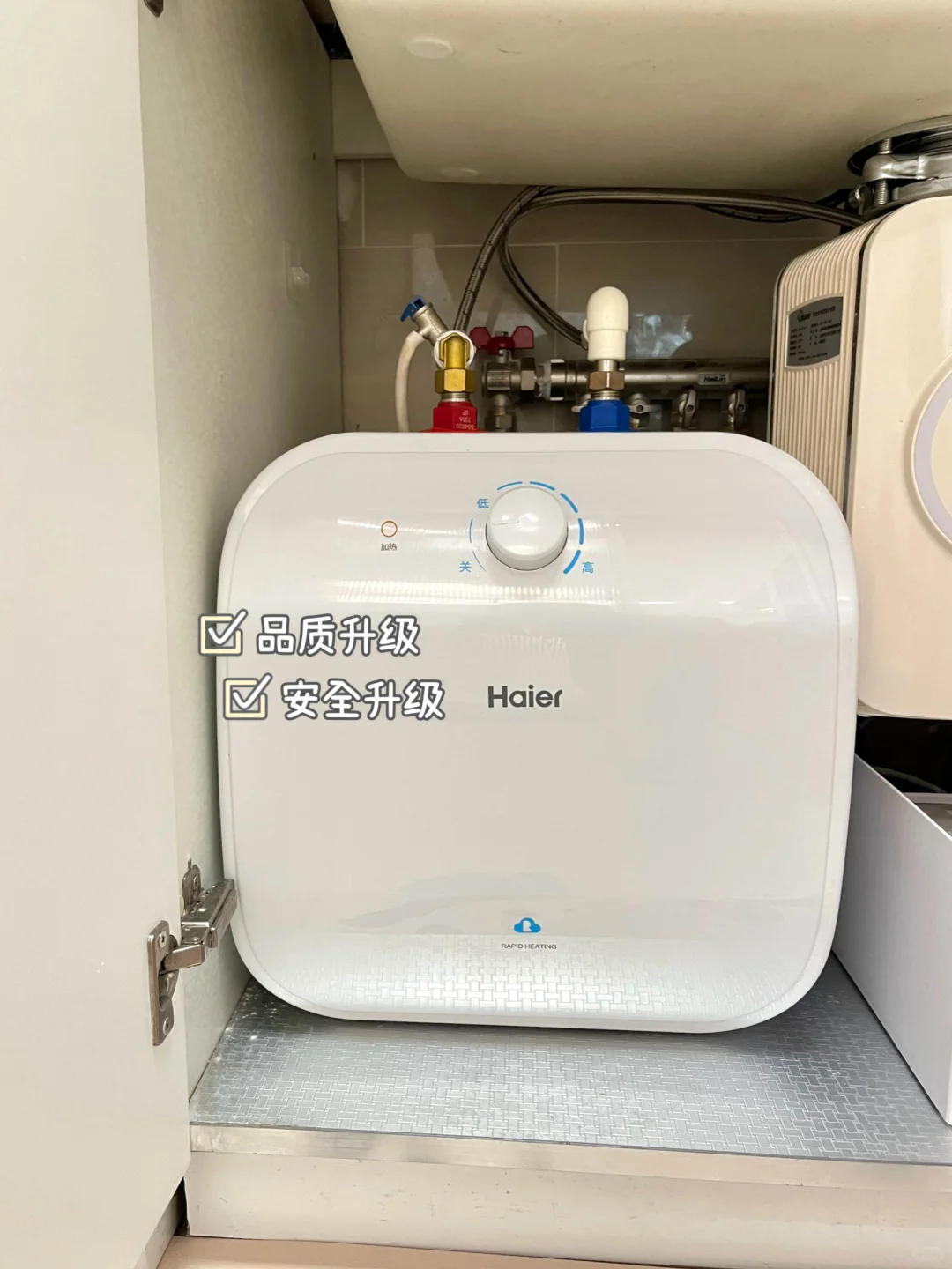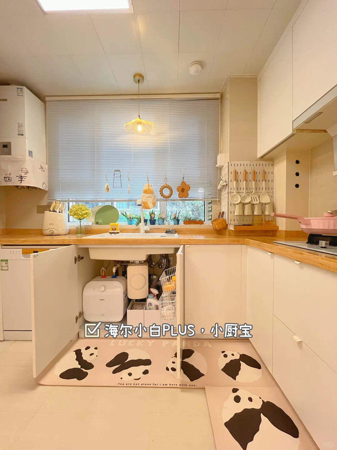 热水器是装在卫生间的,到厨房距离有点远,冬天需要热水洗菜的时候等热水要等很久,所以和热水器一起买了同品牌的小厨宝——海尔小白PLUS。11L容量虽然体积不大,水量升级出温水多至66L,我装在水槽下面也不占空间,而且纯白外观也和我家原木风厨房很搭,平时洗菜水龙头一开就有热水,真的能提升生活幸福感。