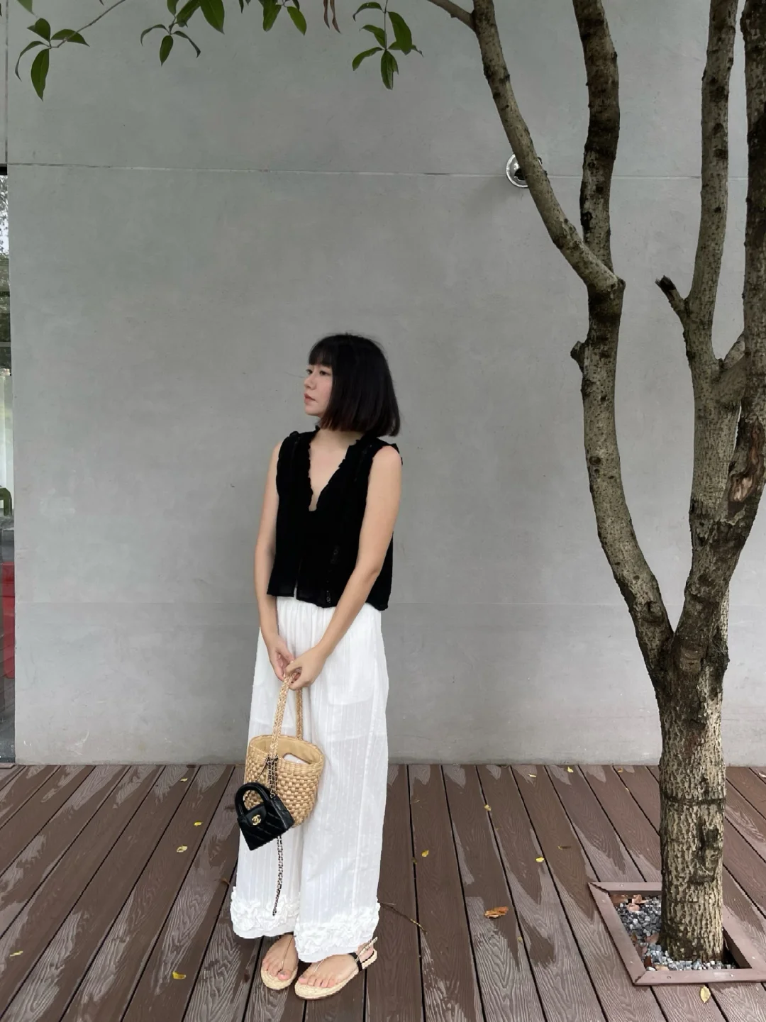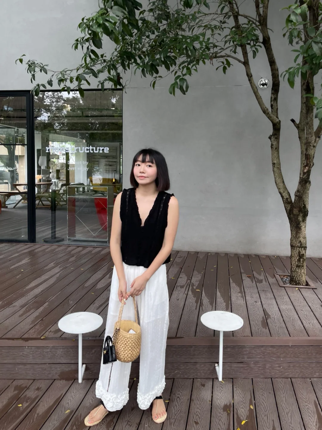 少女清新穿搭,黄色吊带裙搭配米色长裤,轻松惬意。