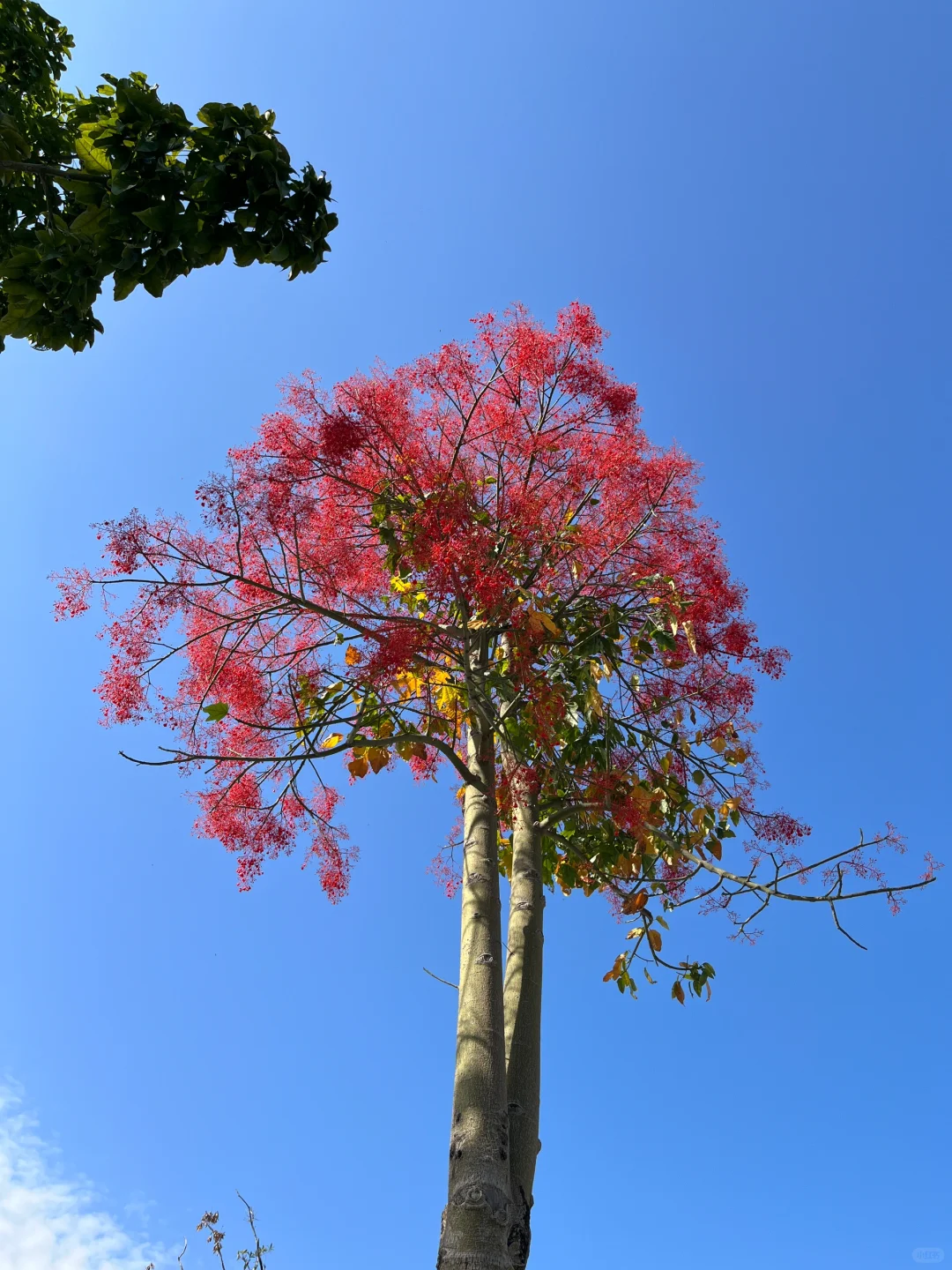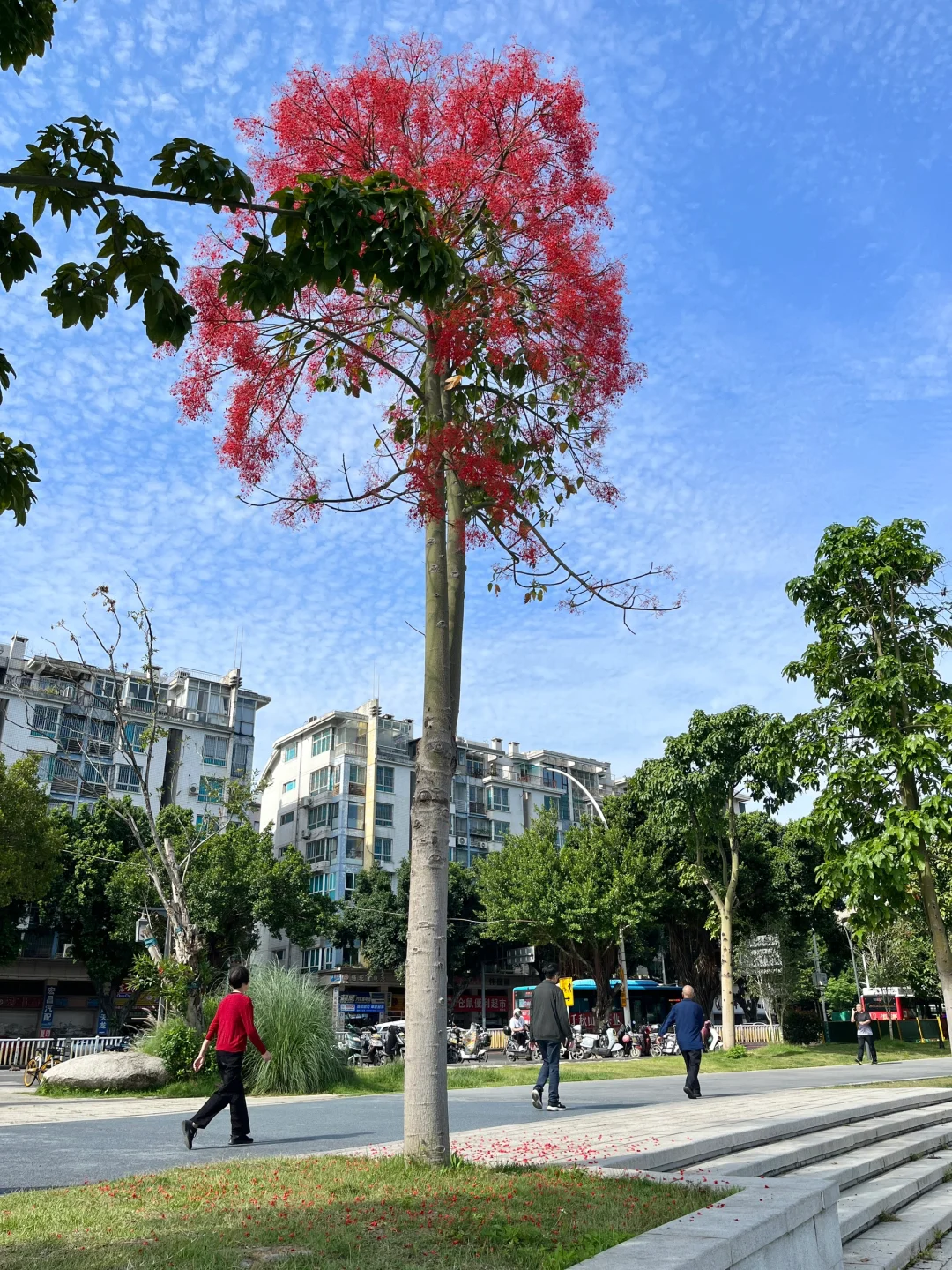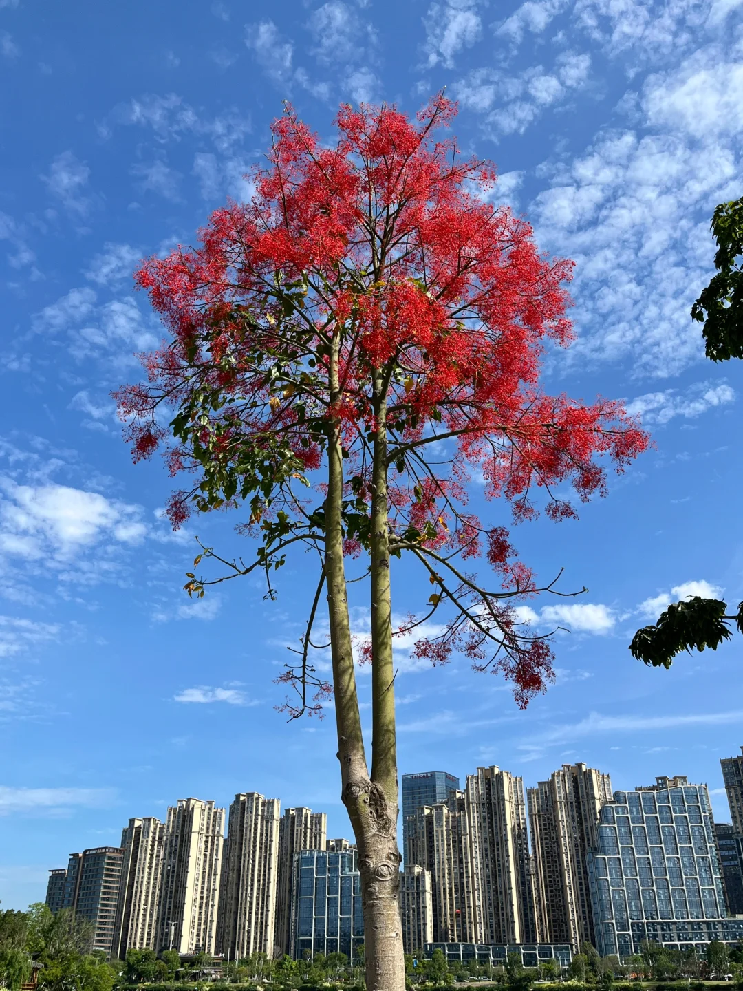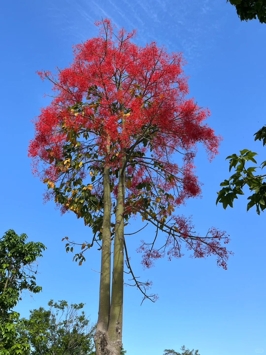 浪漫生活的记录者 槭叶瓶干树又被称为澳洲火焰木,被誉为“世界上zui美丽的开花树种之一”。 它甚是壮美。树形高大挺拔,叶子翠绿油亮、花色红艳,小而密集。 这一段时间,晋安湖公园的澳洲火焰木风风火火地开放了。 远观大树,满树红火,仿佛被泼了亮红色的漆,非常醒目。 “火焰木”这个名字,果然名不虚传!!!