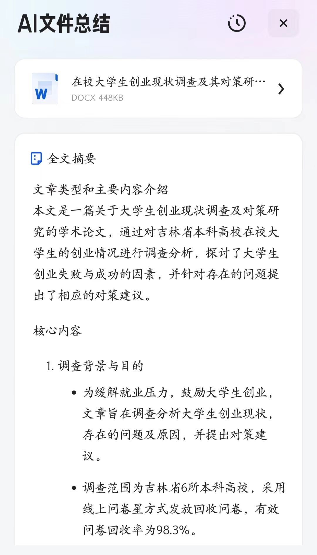 刚好小美手里有一份“关于在校大学生创业现状调查极其对策研究”的文件📑,需要进行汇总和提炼。😭本来对小美来说是一件繁琐且无聊的麻烦任务。😁但是使用夸克超级搜索框的文件总结功能,居然只需要一瞬间,就能完成令我头痛的麻烦任务!🎉🎉