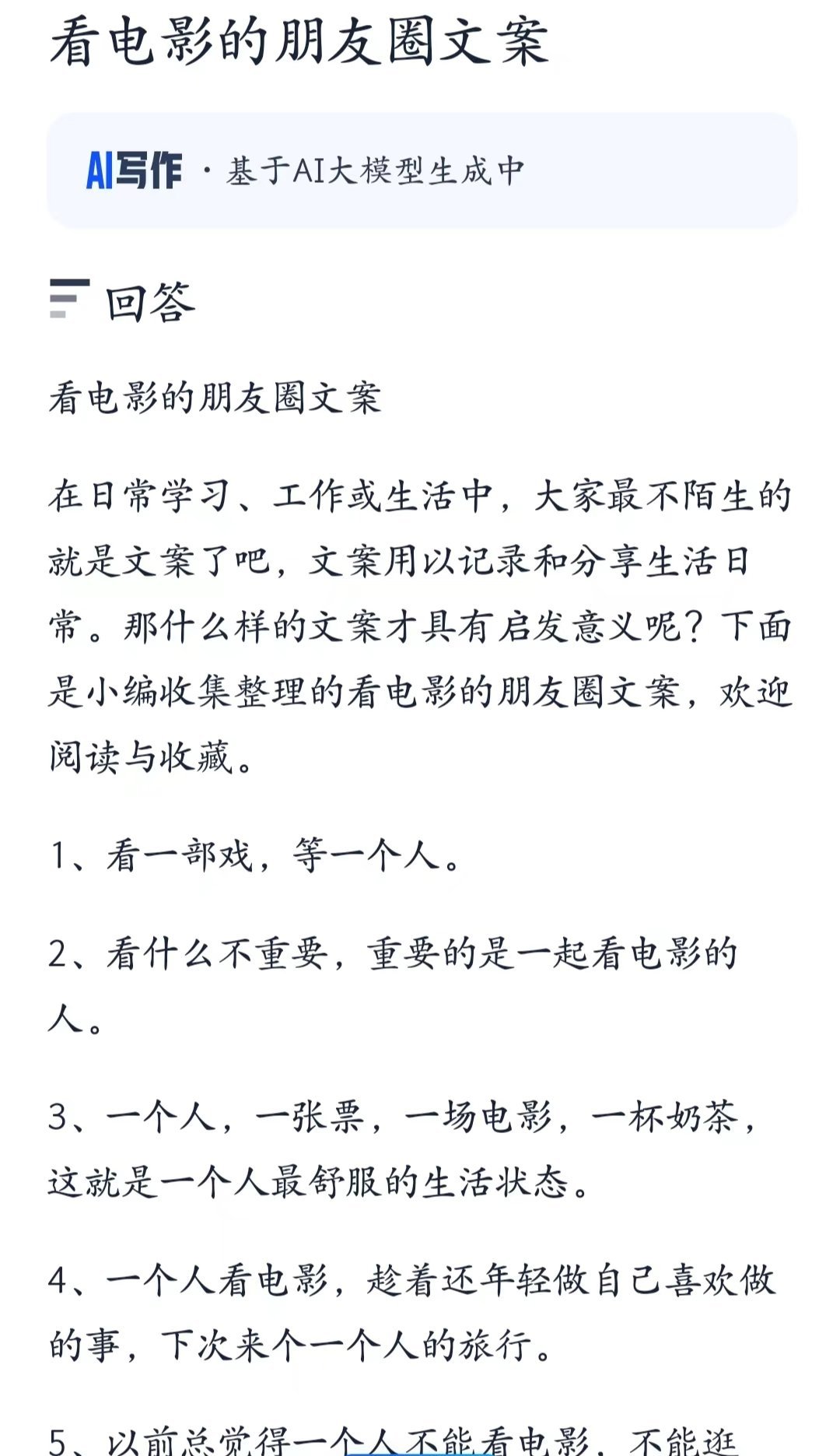 出去玩怎么可能不发朋友圈呢?小美这次周末打算看电影啦🎉~但是,朋友圈的文案一直没法确定,总好像没法写出小开心美的心情😄。还好想起了凯凯代言的夸克AI搜索🔍!可以帮助我进行写作创作,轻轻搜索一下“看电影朋友圈文案”📑,就会出现数十条结果,简直让小美挑花了眼💓💓💓