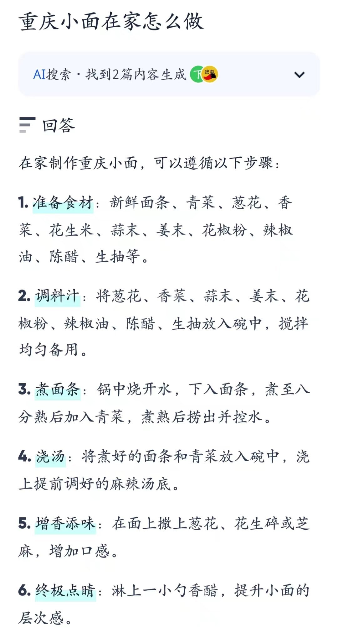 今天周末,小美在家打算自己做饭🍚。突然想吃重庆小面🍜,但是又害怕自己做的不正宗,刚好想起凯凯代言的🔍夸克AI超级搜索框!立马就找到重庆小面具体制作过程🍜跟着夸克做小面,味道果然正宗!💗💗💗