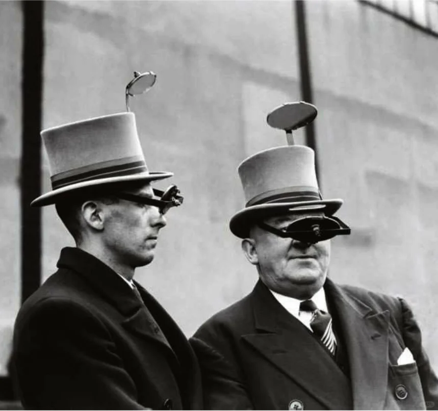 1937年,两个戴着高脚帽的男人在英国工业博览会上。不同的是,他们的帽子上居然有“潜望镜”。这是由一个叫巴特斯的人发明的,当有诸如皇家婚礼或者运动会等热闹事件发生时,这样的帽子就会发挥意想不到的作用