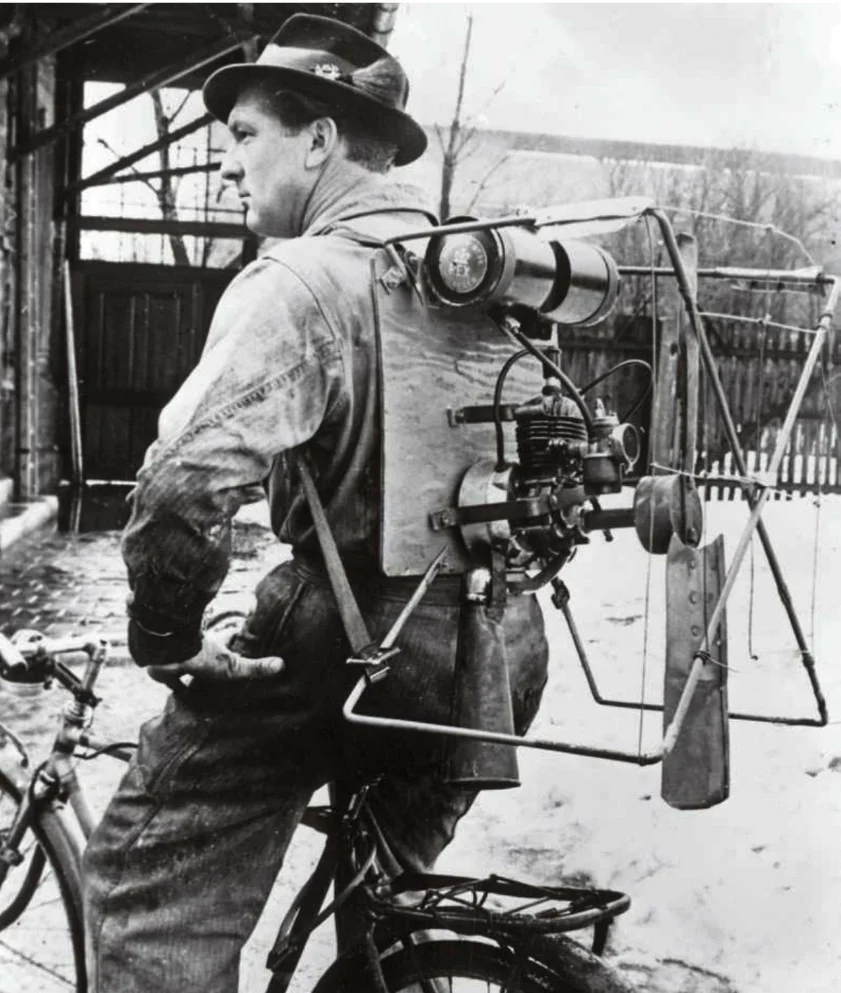1953年2月,德国技工库尔特·雷德布克骑在自行车上,他背着一个复杂的机器。这个机器有向前的推力,能够帮助人们省力地前进