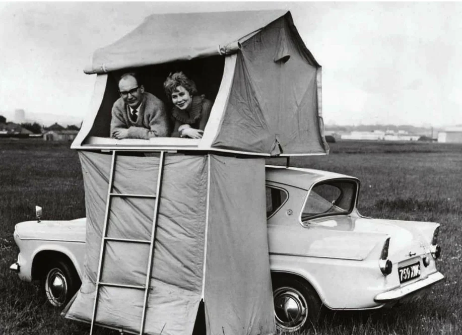 1961年,两个人在他们的车顶帐篷里。这种帐篷以汽车顶部为底,里面能睡两个人,下面还有可换衣服的“更衣室”。这样外出旅游,人们就可以得到他们梦想的假日了