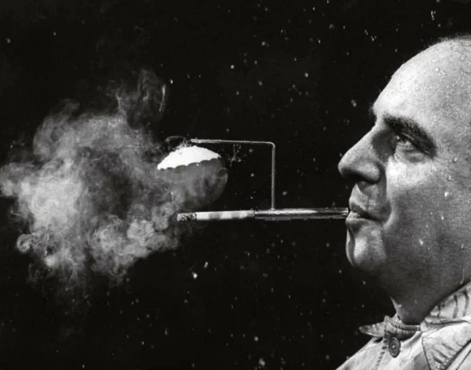 1954年,美国ZeusCorp总裁罗伯特·斯特恩在悠闲地吸烟,香烟上罩了一个他自己设计的小雨伞。即使在烟雨蒙蒙的户外,他也可以无忧无虑地抽上一口