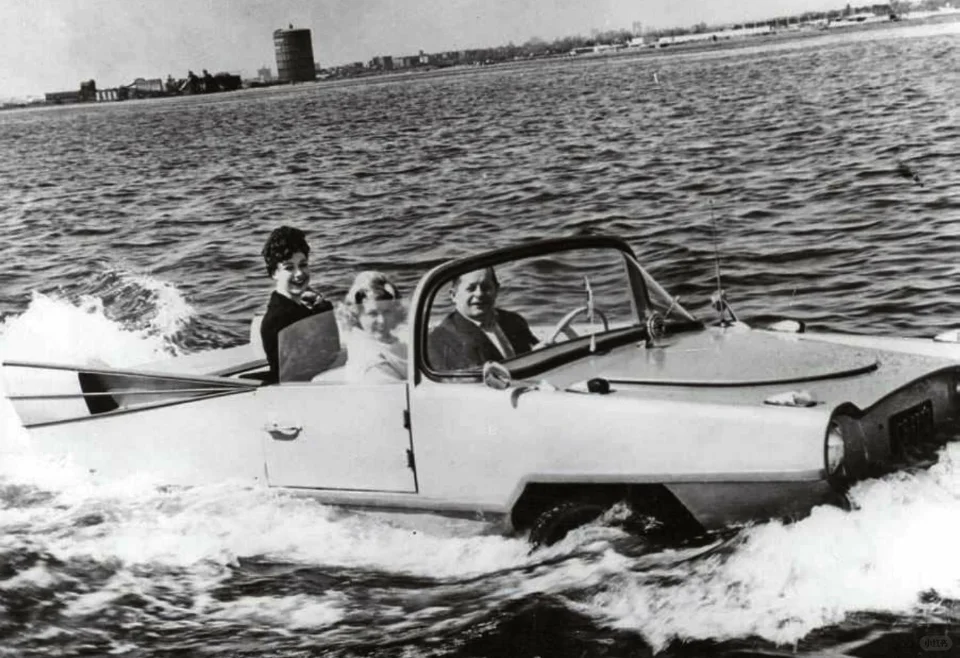 1960年,纽约国际车展上,一种既可以在陆地上行驶,又可以在水里运行的汽车首次面世。车上的驾驶员和两位女士都显得洋洋得意