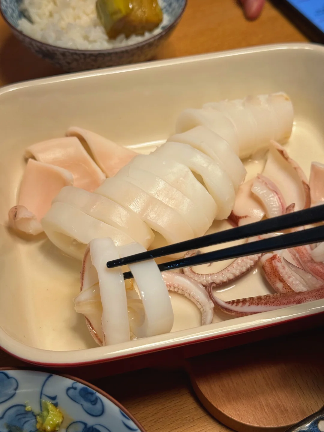 鱿鱼是萨鱼老师家的水晶大管(鱿鱼),非常新鲜,冷水迅速解冻,开水白灼一分钟捞出,然后切环装盘,点芥末酱油即可。