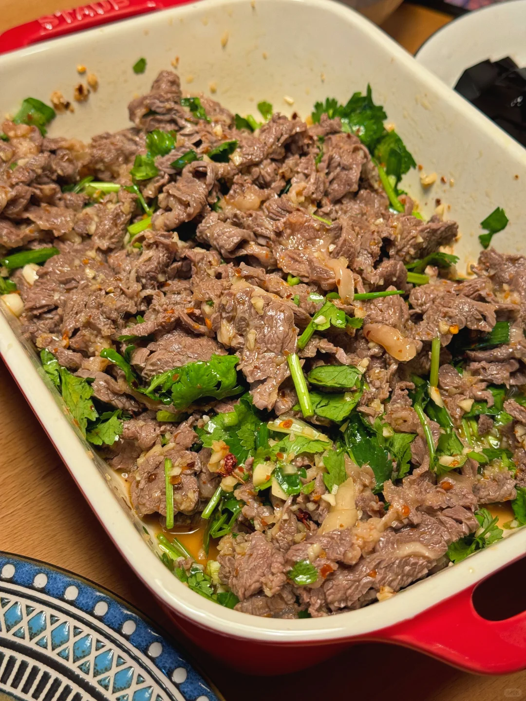 牛肉是家附近菜市场买的肥牛,潮汕牛肉火锅用的,老板会帮忙切片,回家后自己烫熟,装盘凉拌即可。还有一碟是我老婆做的腌黄瓜。