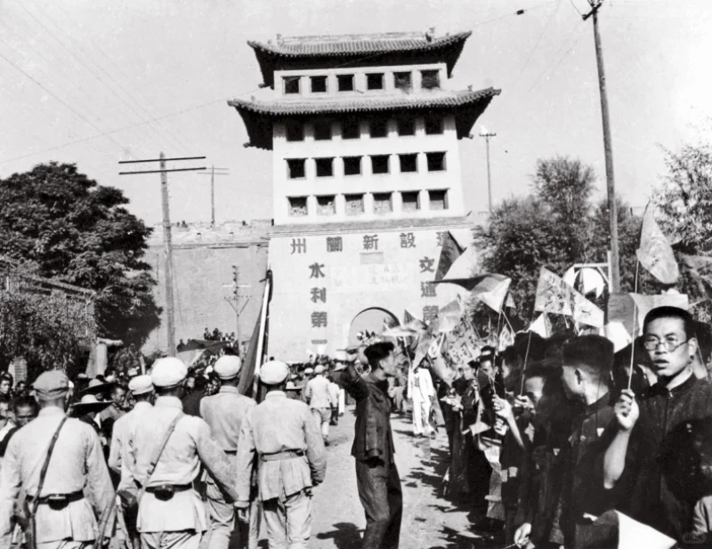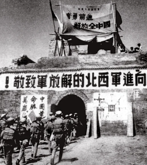 图5:1949年8月30日,兰州解放。图为解放军第一野战军在人民群众的夹道欢迎中举行入城式。攻克兰州使西北国民党军主力丧失大半,解放军进军新疆、宁夏的道路完全打开,为此解放军也付出了9500余人伤亡的代价